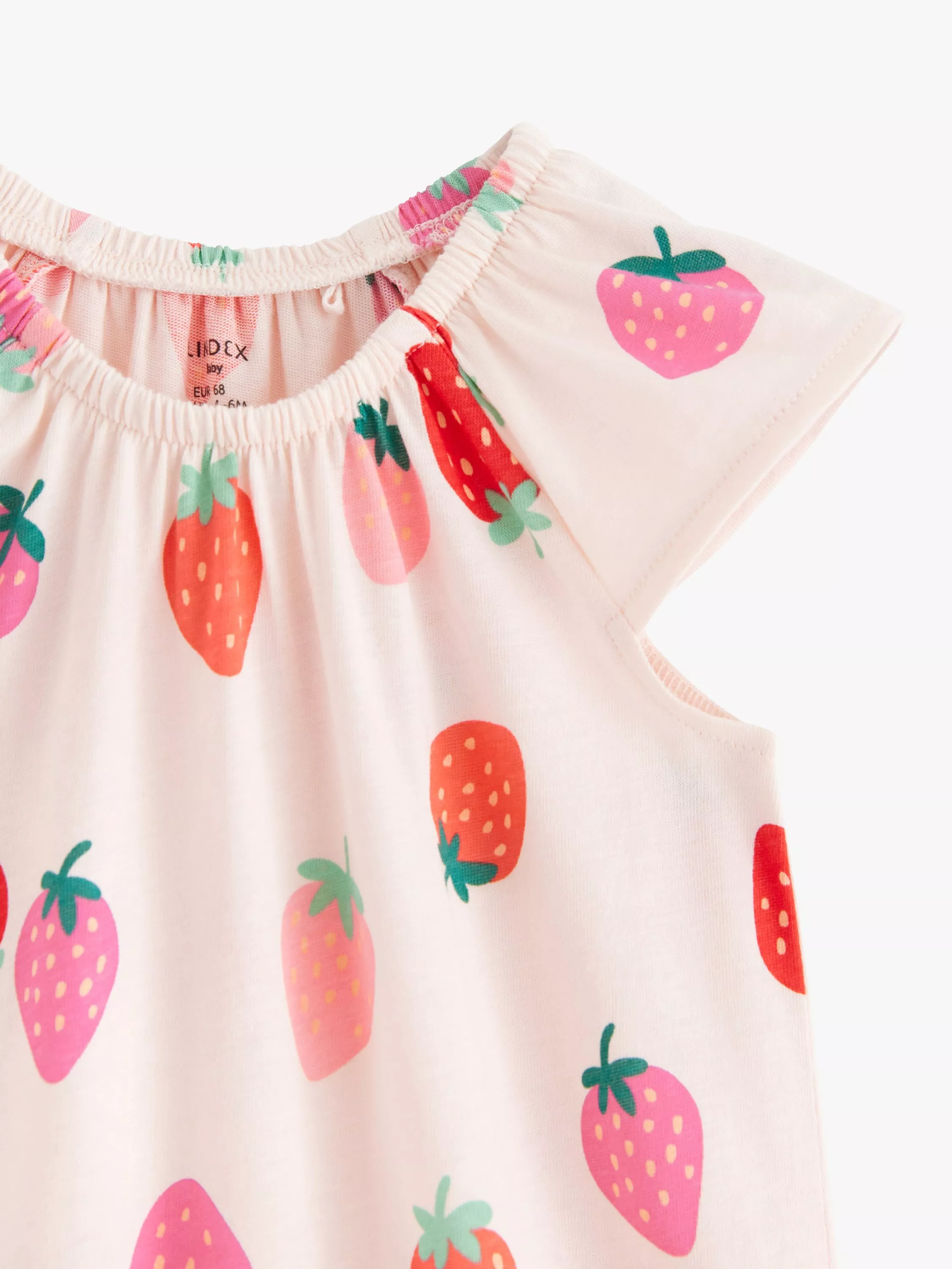 A soft and comfy romper with an all over strawberry print.