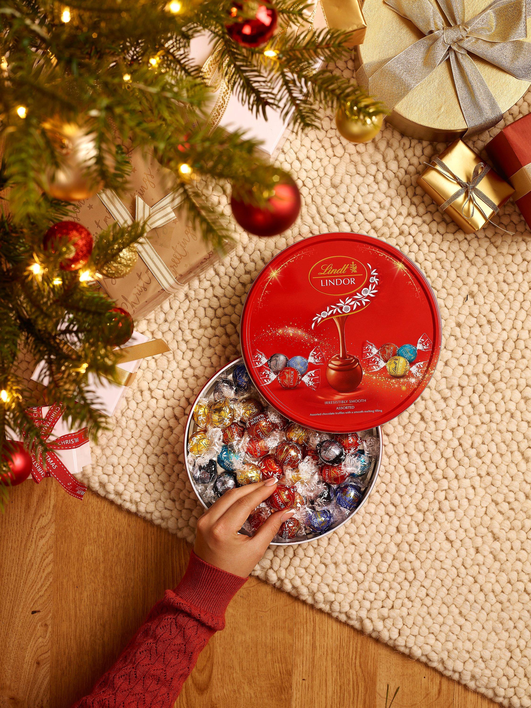 Share the bliss with Lindt's Lindor chocolate truffles, an assortment of six heavenly varieties there's a flavour for everyone: Milk, White, Extra Dark, Hazelnut, Milk & White and Salted Caramel. The Lindt Master Chocolatiers combine their expertise with the finest ingredients to produce a perfectly round chocolate shell filled with an irresistibly smooth melting centre. The Lindor Assorted Chocolate Truffles Tin is the ideal chocolate selection to make sharing this Christmas truly joyful.