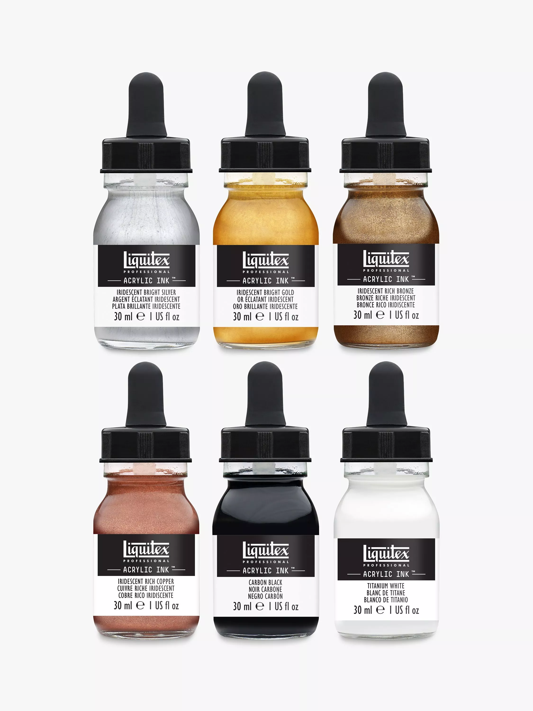 This high-lustre set contains 6 x 30ml Professional Acrylic Ink: Carbon Black, Titanium White, Iridescent Bright Silver, Iridescent Bright Gold, Iridescent Rich Bronze, Iridescent Rich Copper.