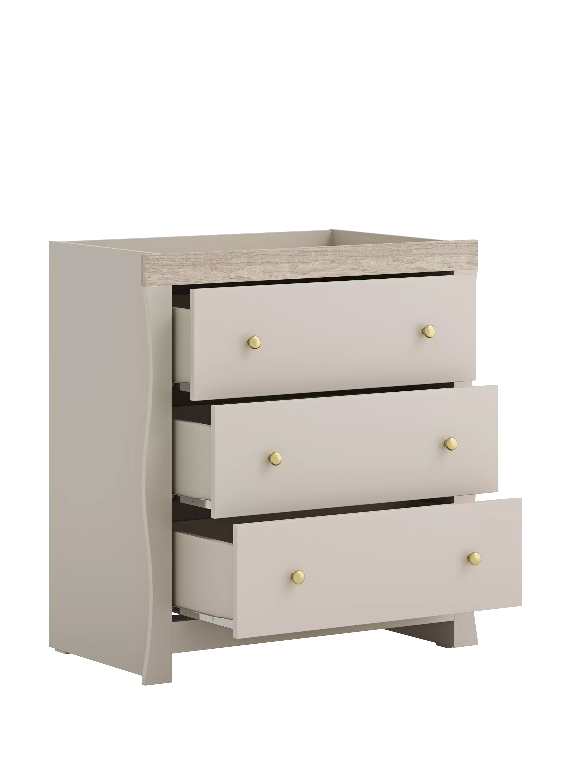 The Little Acorns Celeste Dresser has been designed with a stunning curved look, this beautifully crafted dresser and changing unit comes with 3 large, spacious drawers and a baby changing unit. Each draw is 40cm deep giving you lots of storage.
