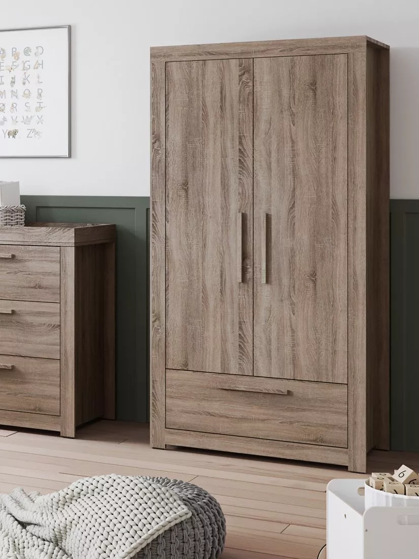 The double wardrobe is a great size, offering lots of useful storage for all your baby’s needs. It boasts 2 shelves with hanging rails underneath them and a spacious drawer which has the brand's signature metal support on the bottom. The lower shelf and hanging rail are removable, allowing for longer and larger clothes to fit offering many years of use that lasts as your child grows.