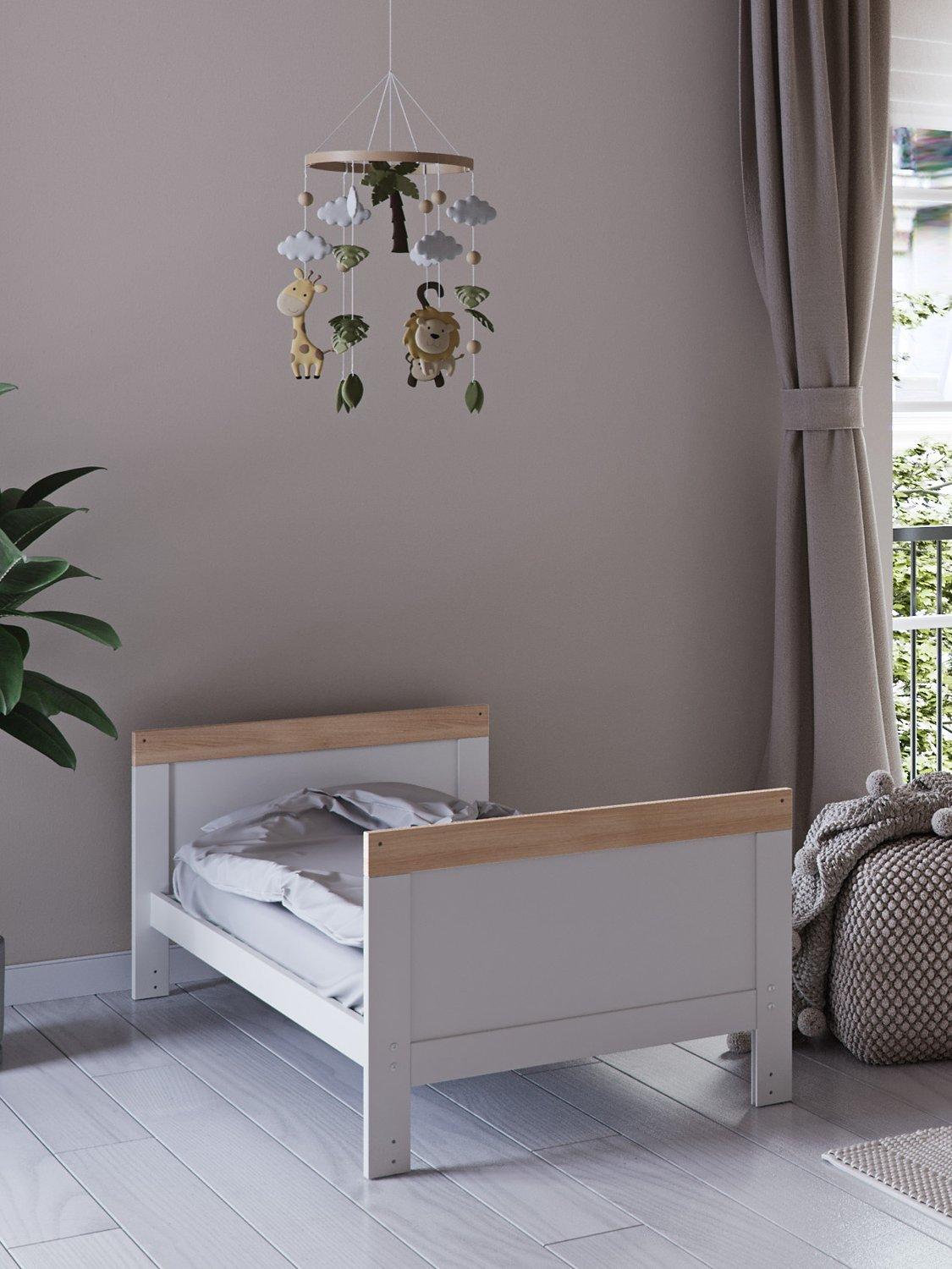 The cotbed has 3 different mattress heights, the upper height for newborns which enables easy access in the early stages so you do not have to bend down. There's an optional middle height and then the lowest height when your bundle of joy can sit up unaided and needs the extra protection of higher sides. The teething rails are there to protect babies teeth and gums, as they grow and develop. When you decide the time is right for your toddler to have their own ‘big-bed’, the cotbed easily converts into a Toddler-Bed utilising the same mattress and lasting up to 4 years.