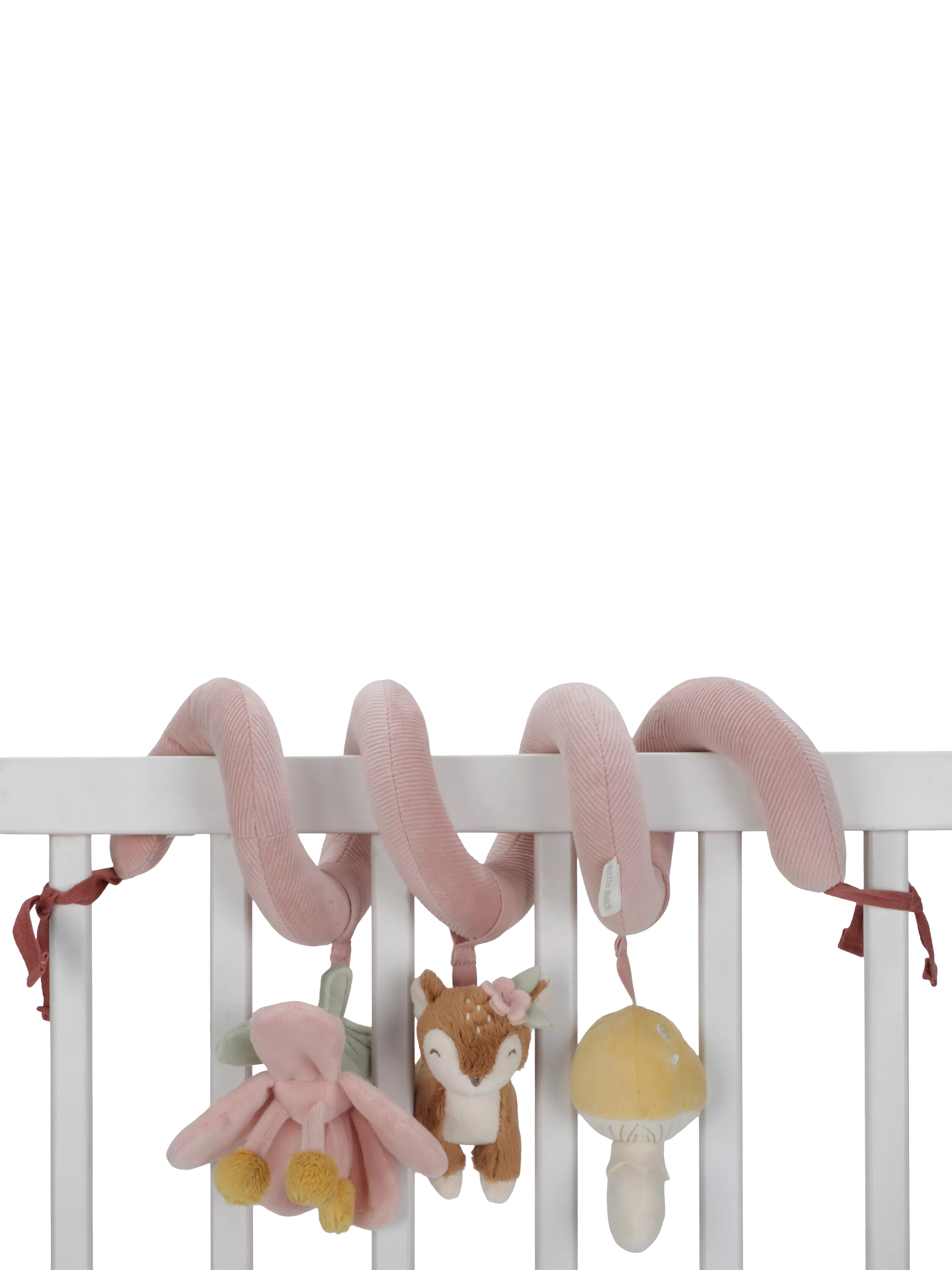 Easily attach this practical toy to anything from a crib to a playpen or car seat. It strengthens the senses and stimulates hand-eye coordination. The activity spiral is made of corduroy with cotton and features a small deer, a little mushroom, and a beautiful flower.