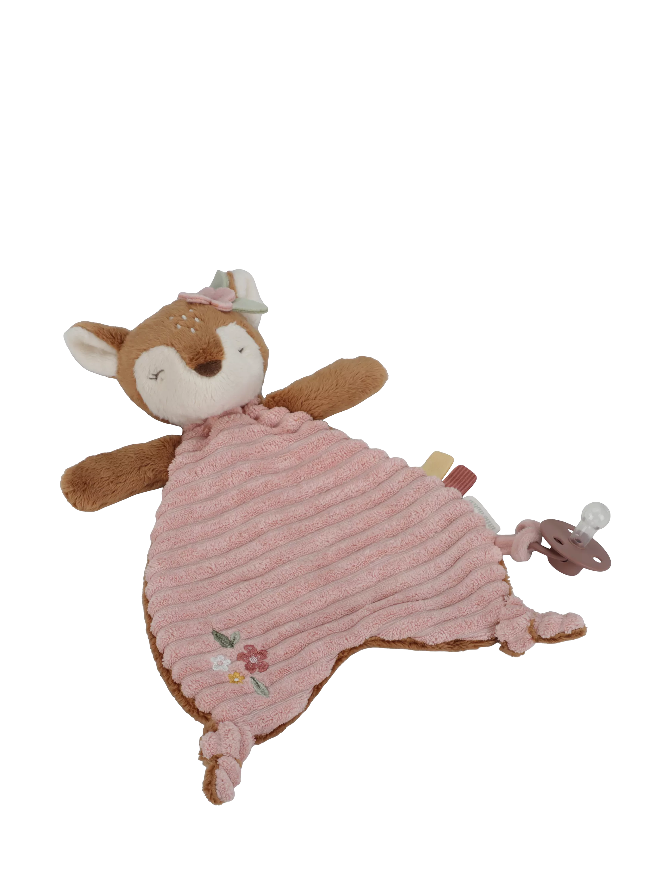 The friendly deer will soothe you with its magical softness, offering a comforting embrace whenever you need a buddy by your side. The soft cloth of its body features delightful details including playful labels, a Fairy Garden embroidery, and two knots for tiny hands to grasp and hold onto. With the convenient loop, it's easy to attach a pacifier to keep it close.