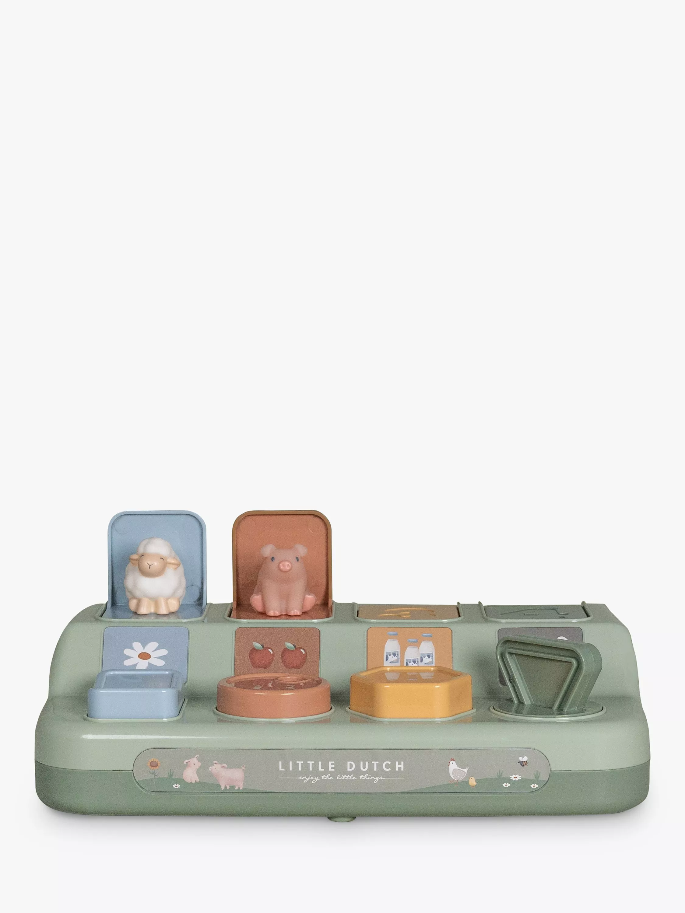 Promote your child's imagination, creativity and motor skills with this Little Dutch Pop up Farm game. Playfully train colour and shape recognition. Press or turn the buttons and ta-da a little animal from the Little Dutch Farm theme appears.