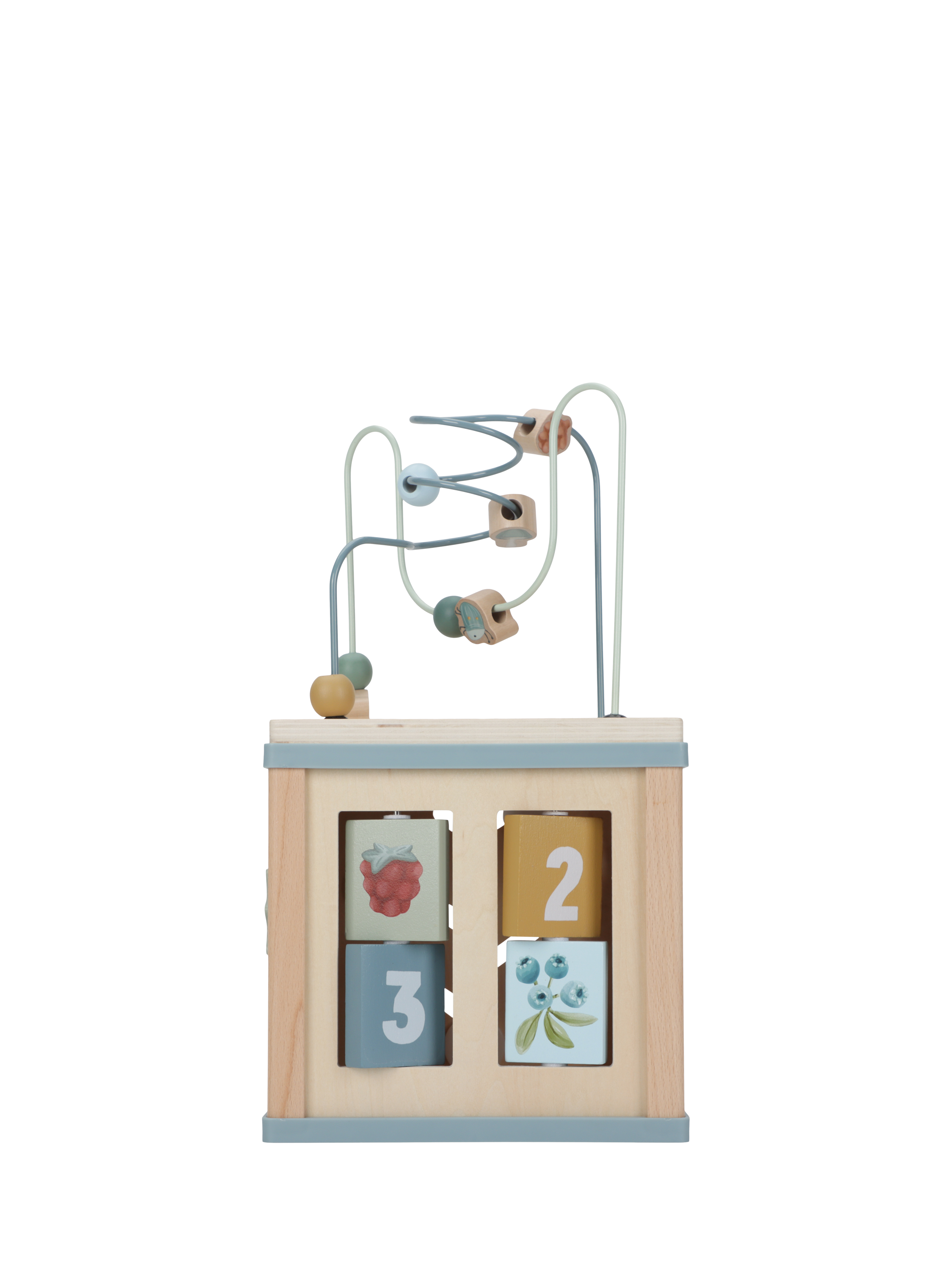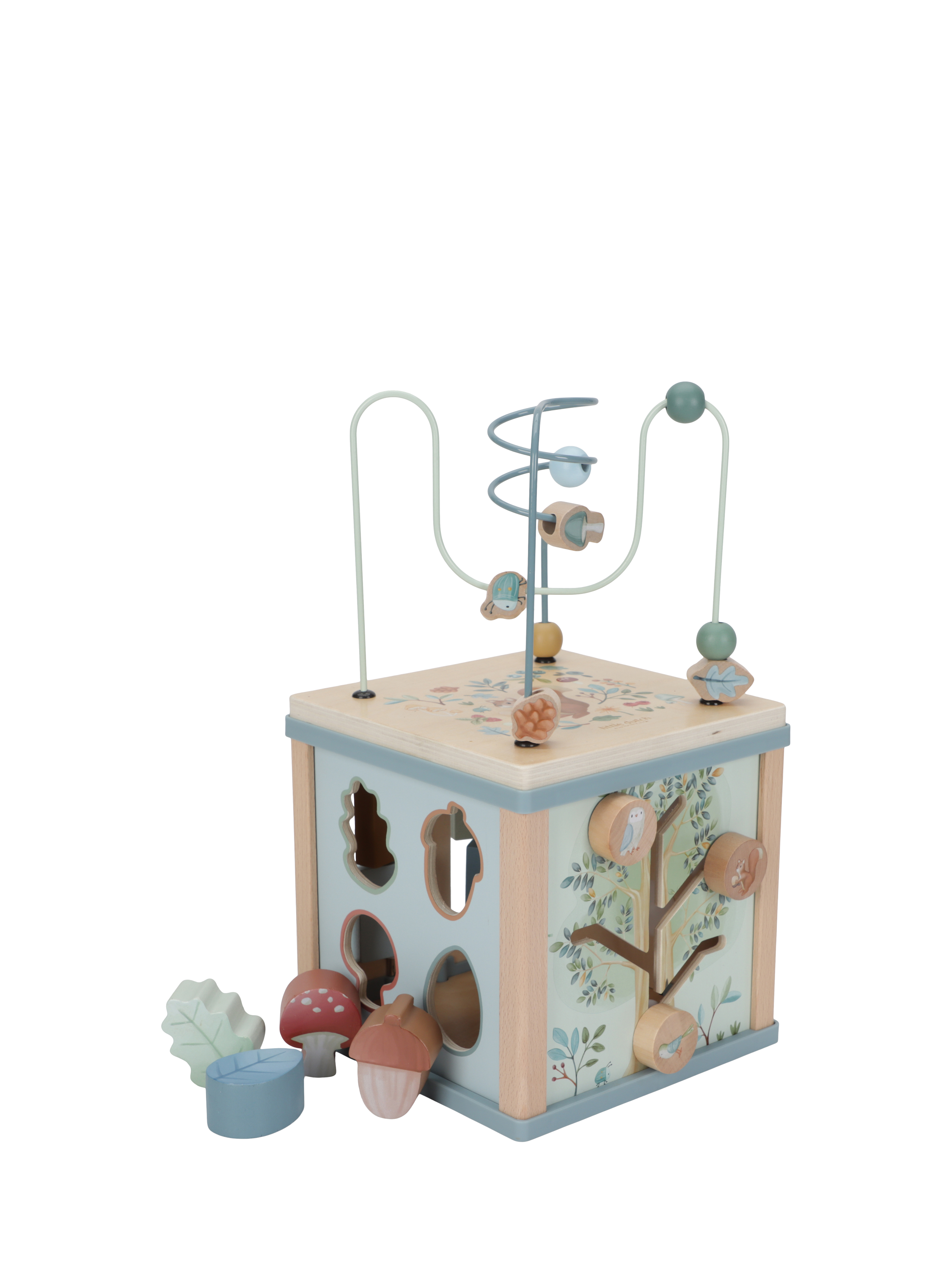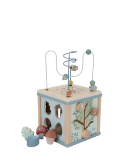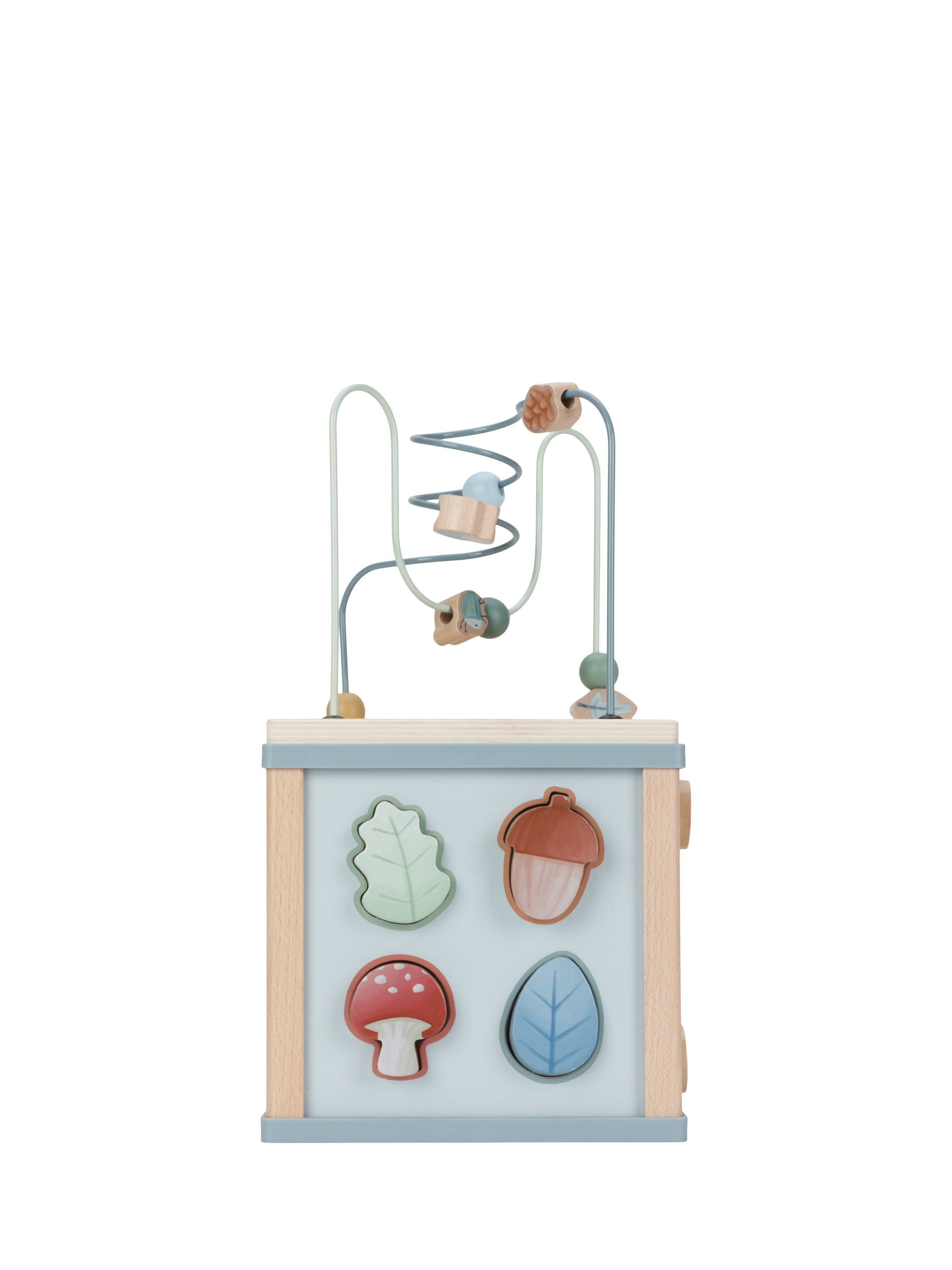 Embark on an adventure exploring every side of this entertaining cube of activities. Each side features delightful Forest Friends elements and presents a fun educational activity, including a shape sorter, spinning gears, puzzles, and a challenging bead maze on top.