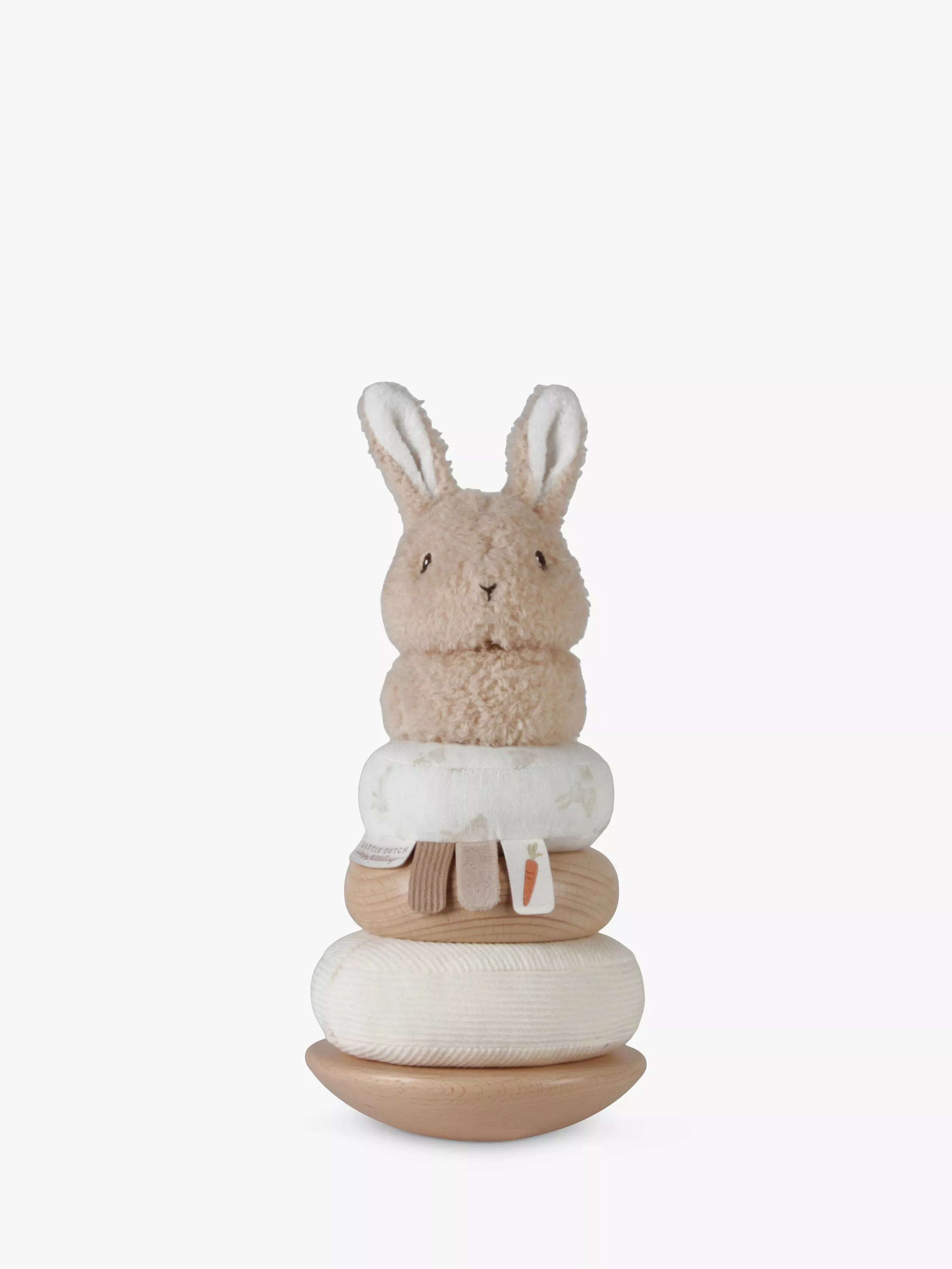 The Little Dutch Baby Bunny tumble stacker is specially designed to promote children's hand-eye coordination while they enjoy active play. Children are encouraged to place the wood and fabric rings in the correct order and stack them on the wobbly pyramid. A fun challenge to keep trying!