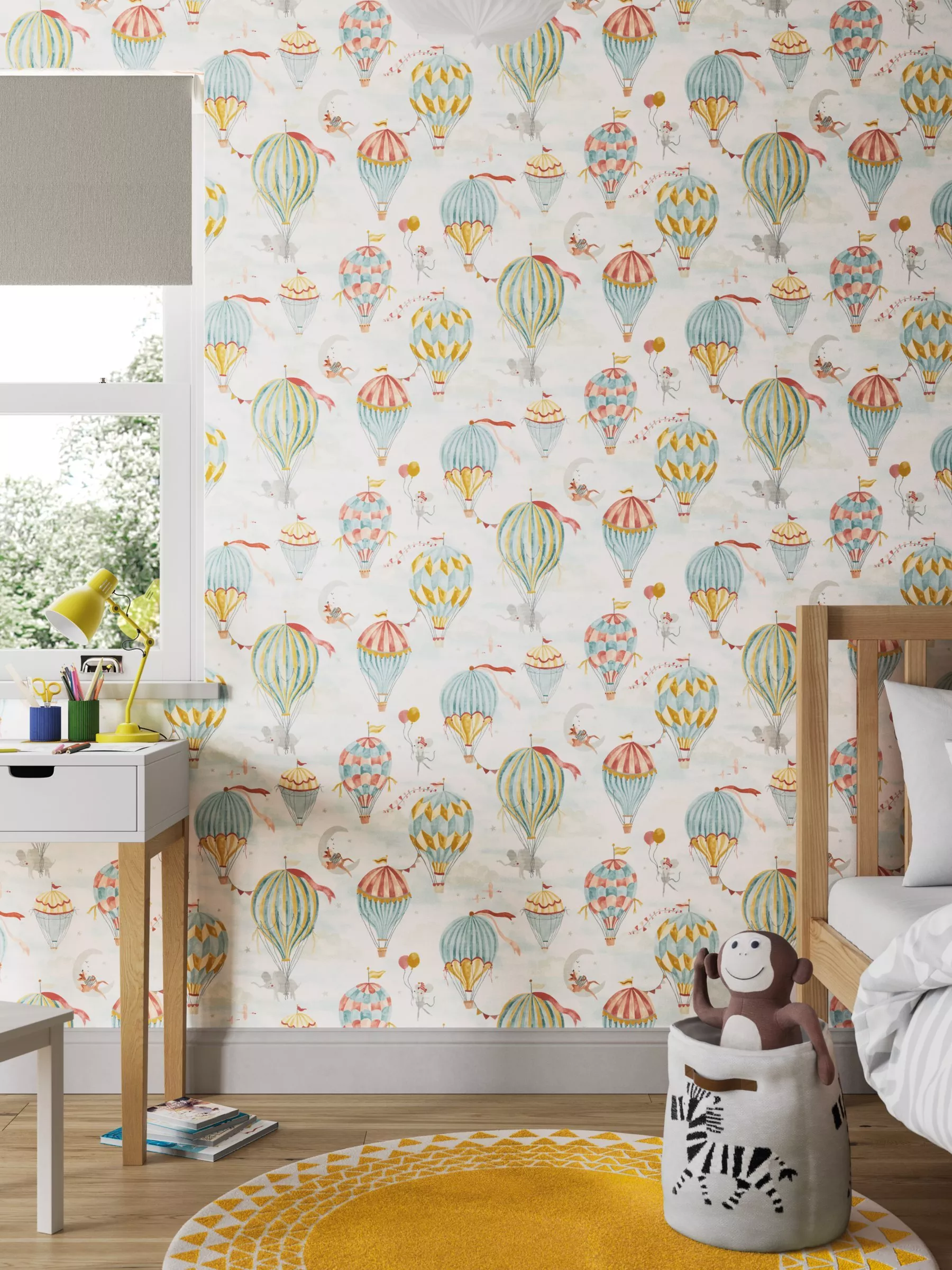 A beautiful children's print with floating balloons and magical creatures.