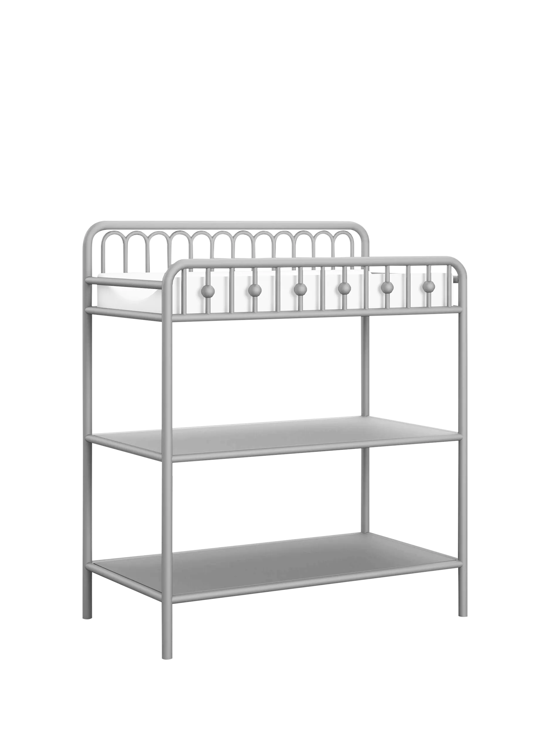 The powder coat on the arched metal frame gives the changing table a modern twist. The 2 open shelves can keep all of your changing essentials like diapers, wipes, and creams organized and easy to access. It fits a standard-size changing pad (not included).
