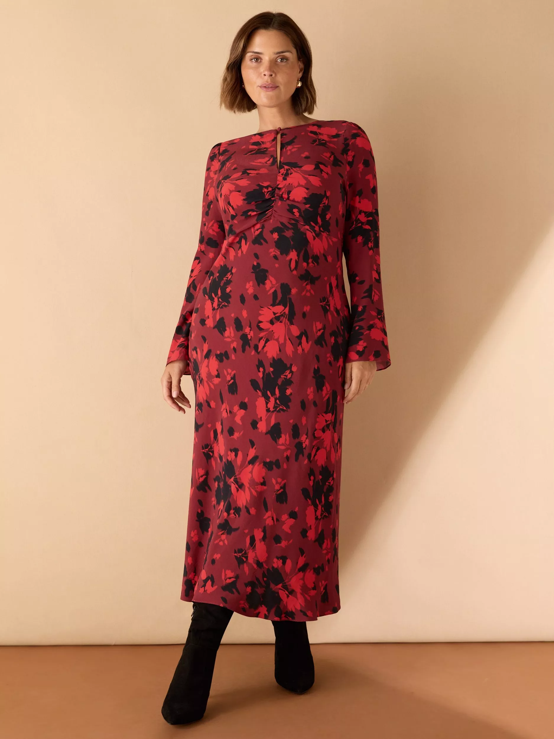 Make a bold impression in this Red Abstract Print Ruched Front Maxi Dress, featuring a flattering V neckline with button fastening and a ruched bust design that enhances the silhouette. The long flared sleeves and partially elasticated waist offer a comfortable, feminine fit, while the lined bodice ensures a smooth finish. Perfect for special occasions or standout daywear, this dress combines eye-catching print with elegant detailing.