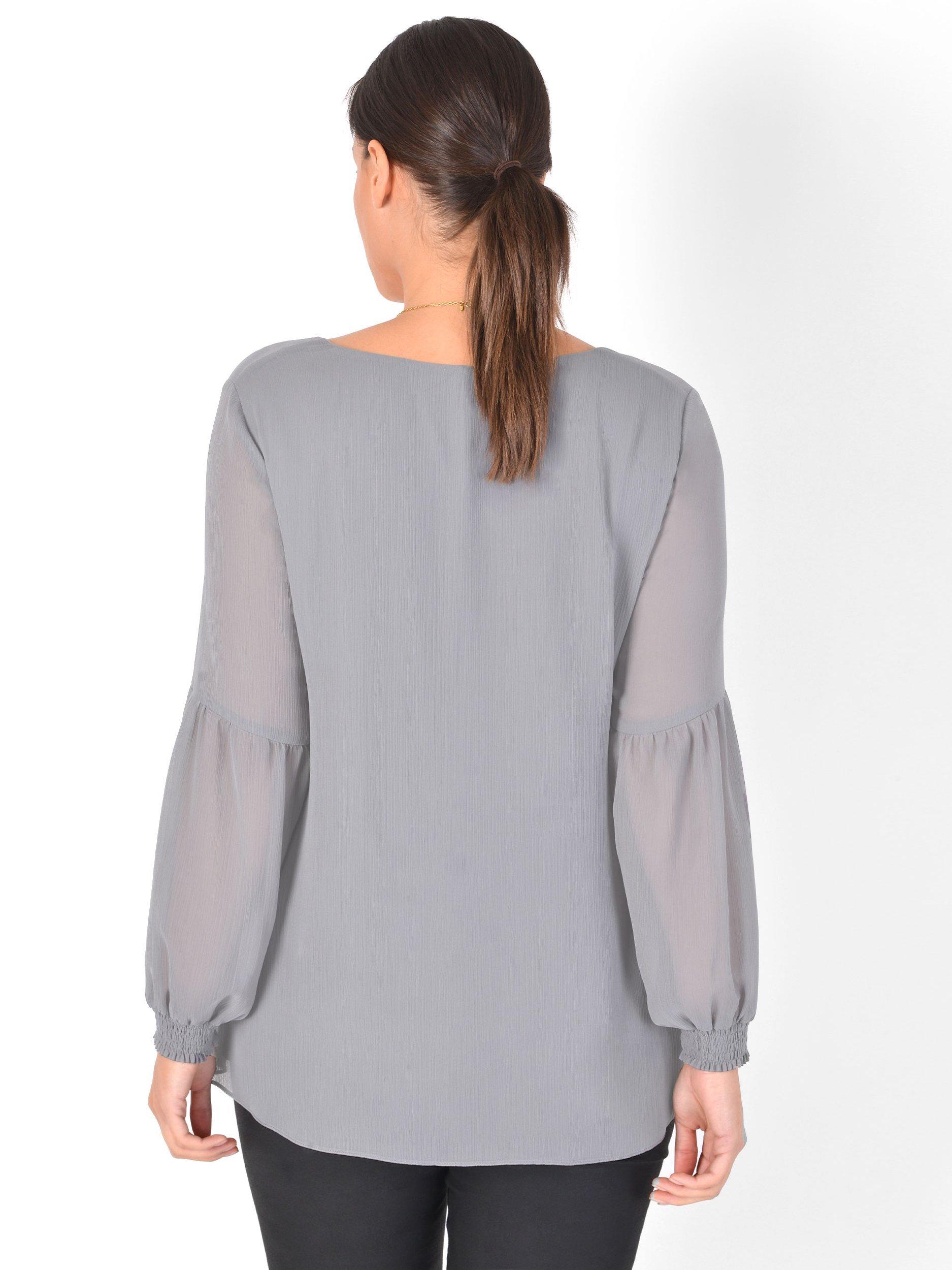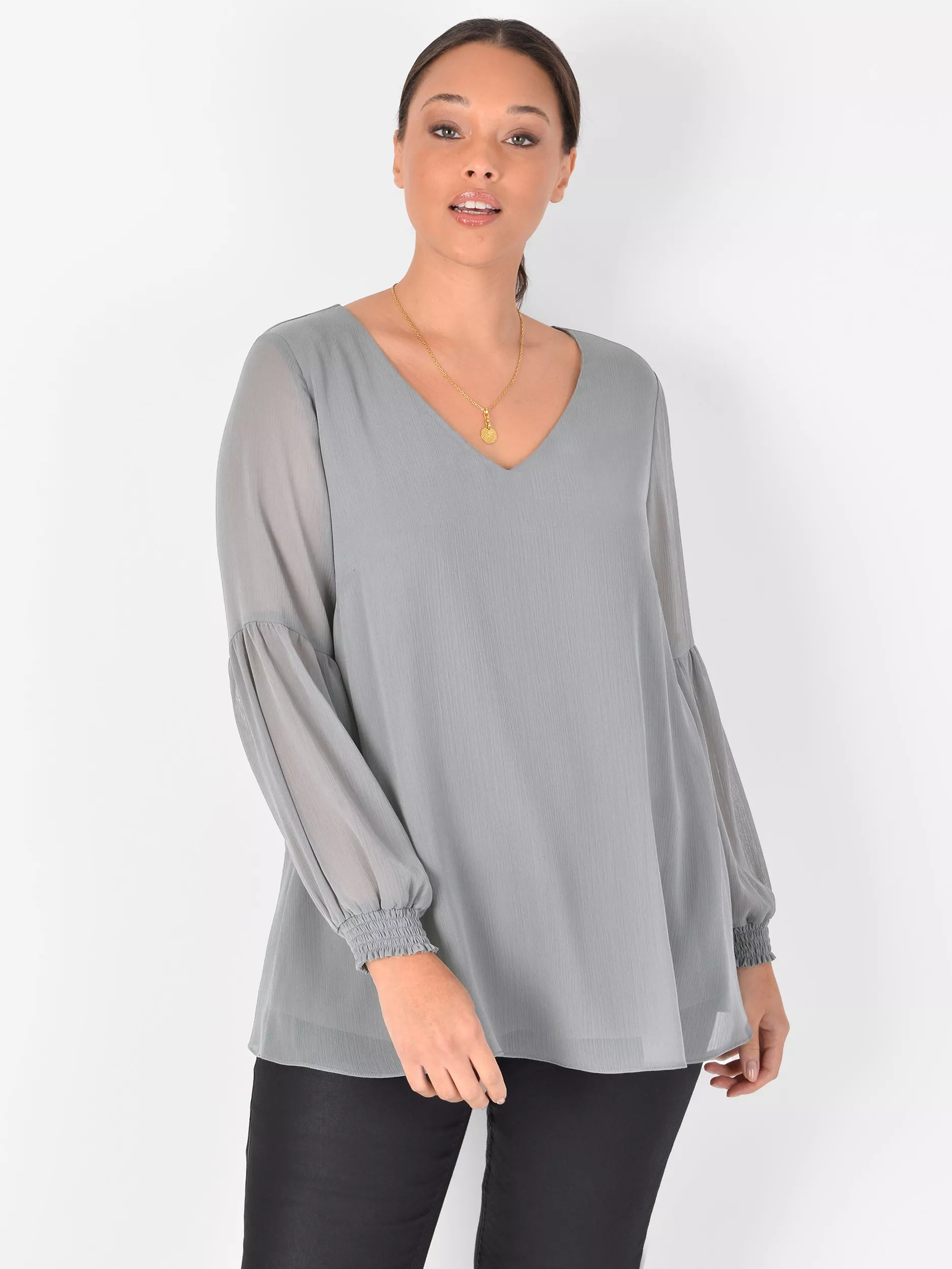 Cut with a classic v-neck and balloon sleeves, it is made with durable fabric for longevity of wear and will carry you from daytime to evening in style.