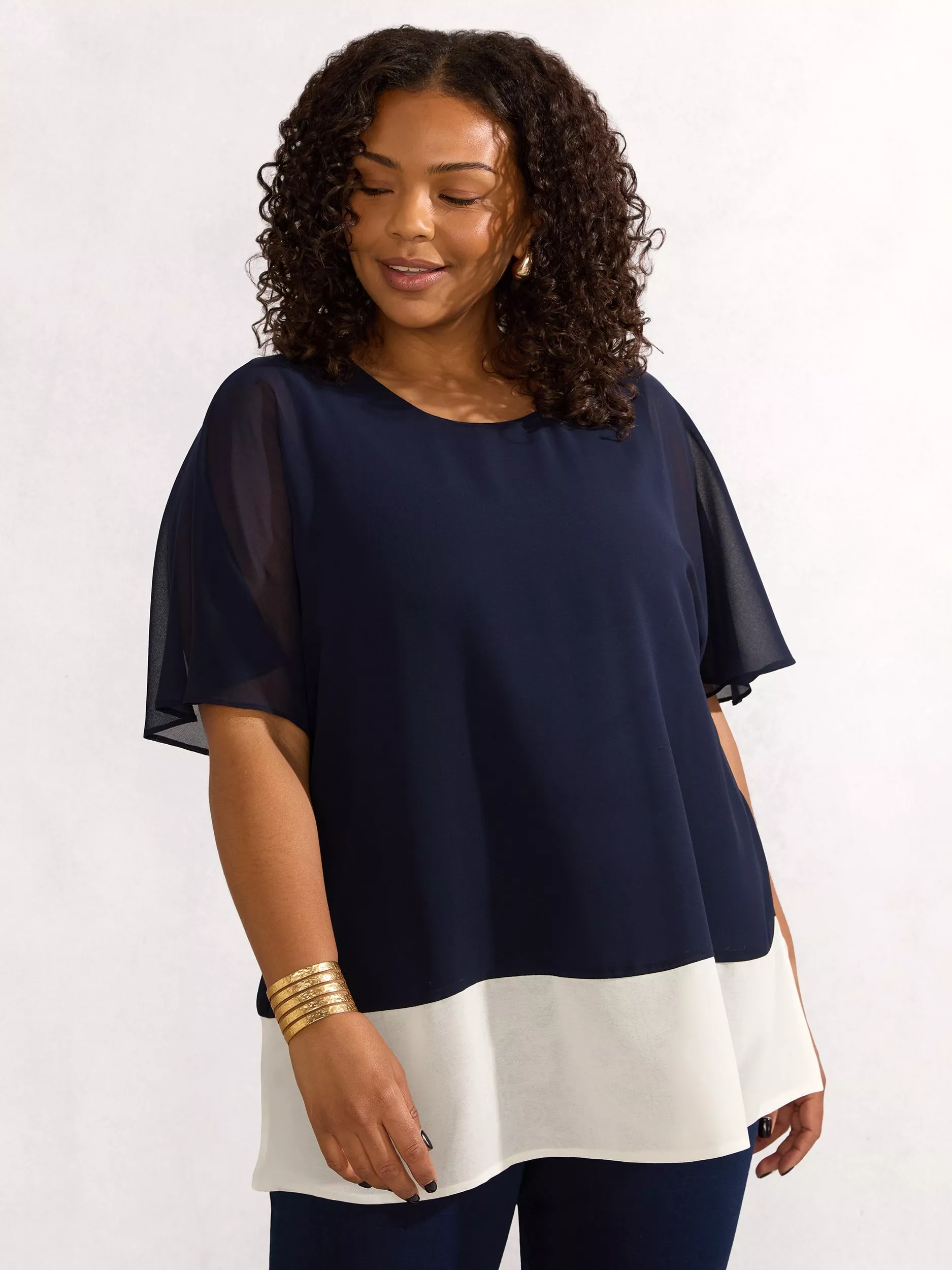 For the casual every day, this overlay top from Live Unlimited features a colour block design. Cut with a round neckline and short sleeves, it is made from a light yet durable fabric.