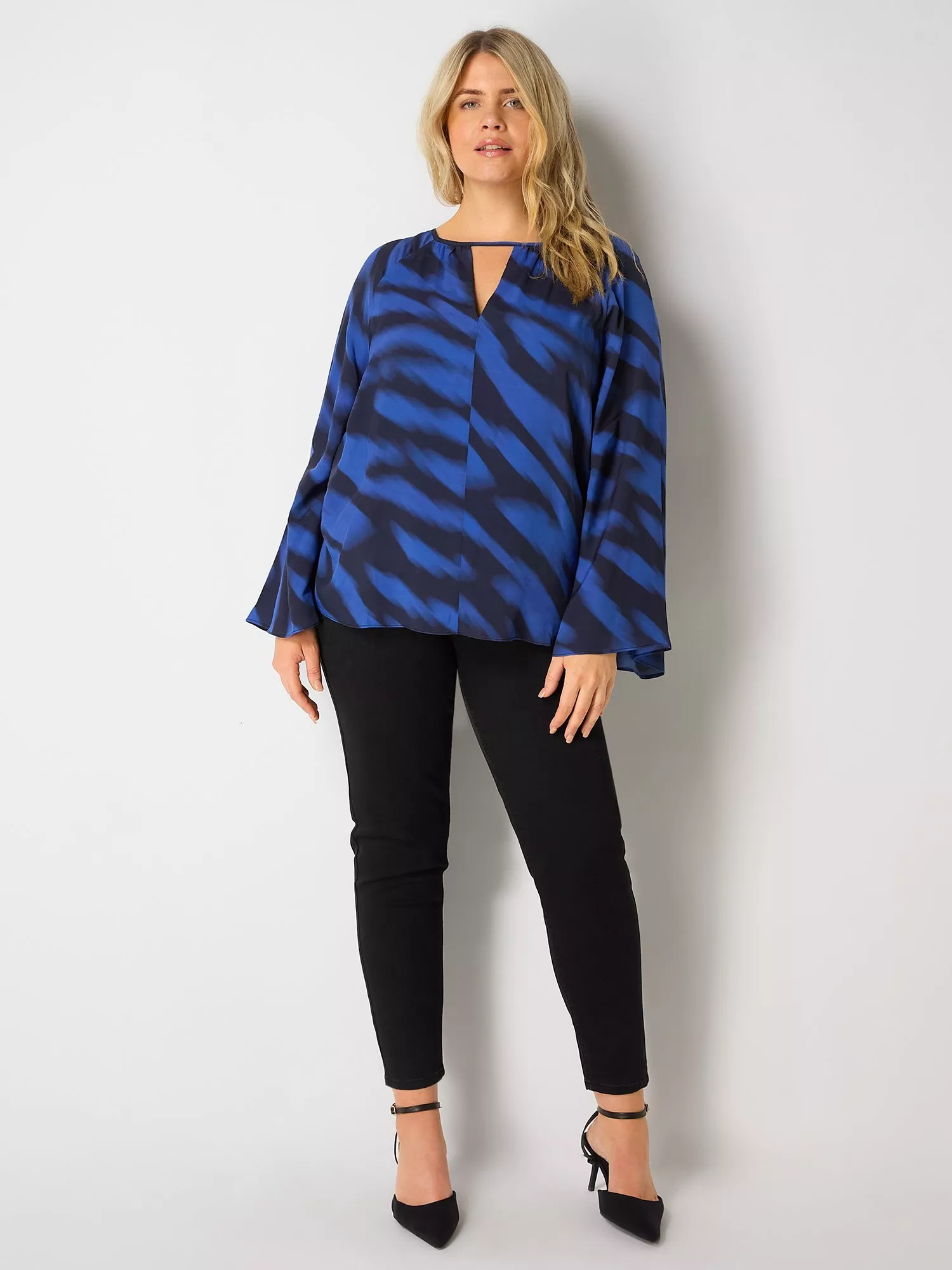 In a striking blue and black print, this blouse is cut from a floaty woven fabric that moves beautifully. It has a v neckline with a keyhole detail, as well as straight raglan sleeves. The bold print is fashionable but yet timeless making it the perfect day-to-night blouse that you can dress up or down depending on your plans.