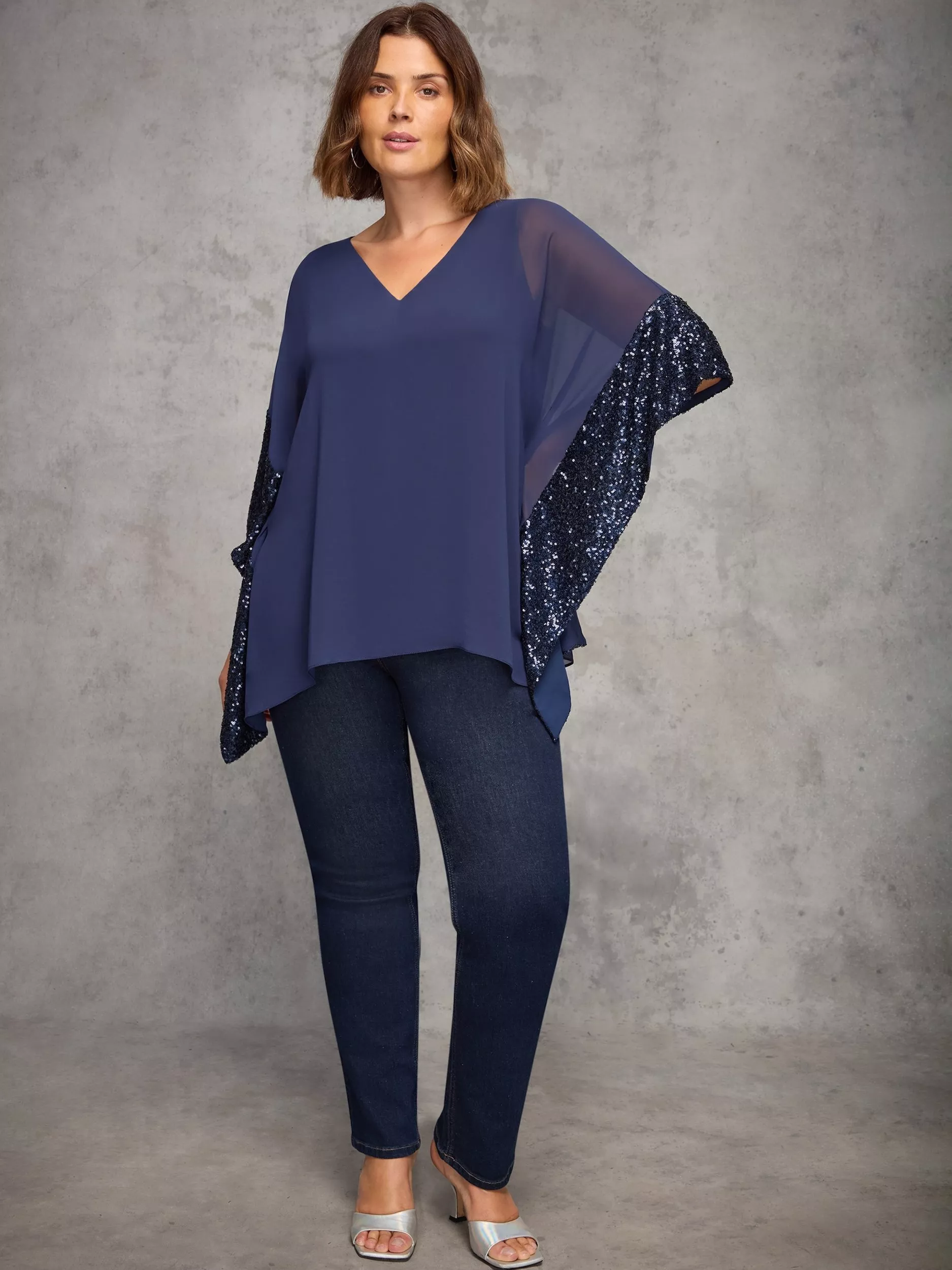 A sparkling jersey top by Live Unlimited. Featuring a V-neck and mock sleeves, it boasts contrast sequin embellishment. Transition with ease from daytime to after-dark.