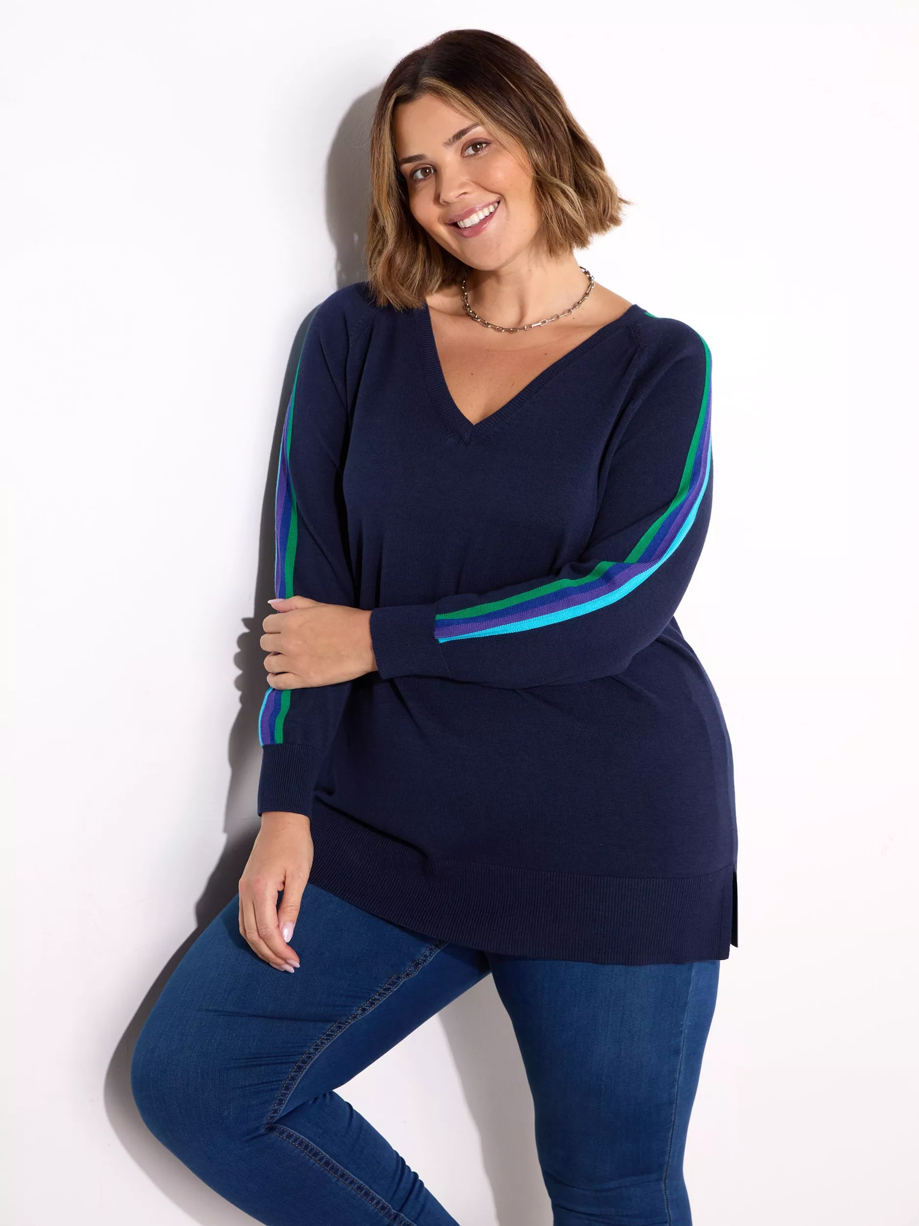 This Knitted Jumper is so soft and comfortable to wear. It has a contrast stripe design going down the sleeves which adds so much detail. The V-neckline is so flattering and the long raglan sleeves create a gorgeous silhouette. It slips on easily over your head and looks great paired with any of our jeggings.
