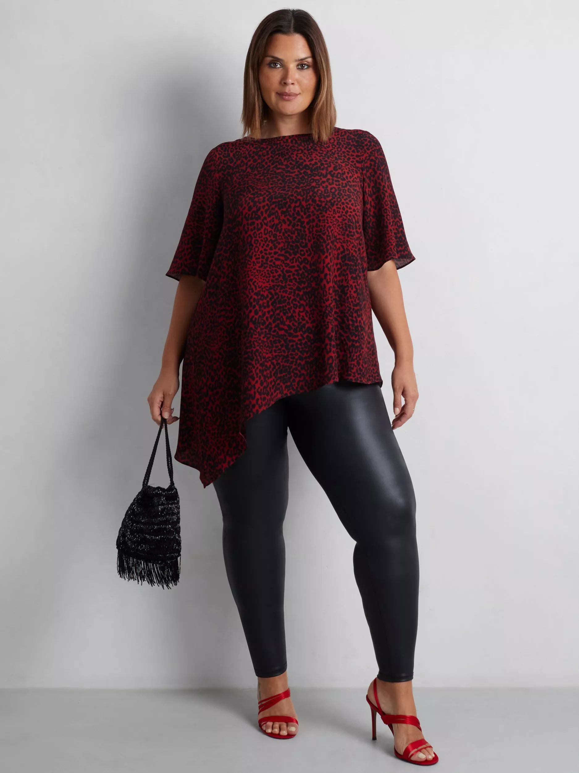 In a gorgeous modern leopard print, this top is cut from a soft floaty woven fabric that moves beautifully. It has a stylish crew neckline and short sleeves, as well as an asymmetrical hemline with an overlap design that is ever so stylish as well as being designed to flatter. The longline length means this is the perfect piece to wear with jeggings or leggings, depending on your plans.