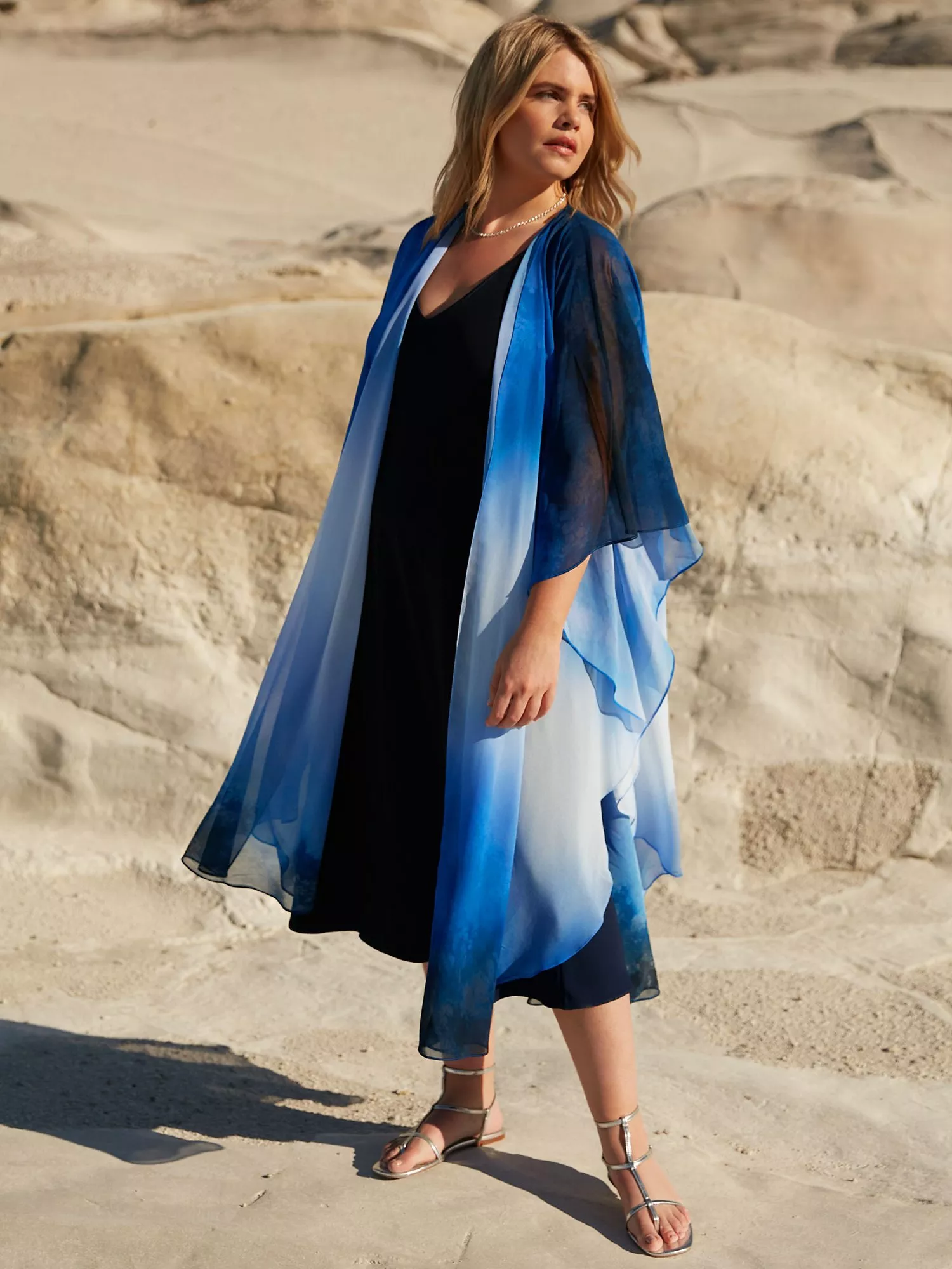 Cut from a soft woven fabric, this kimono has a striking ombre print. With an open front, it has loose, 3/4 length sleeves and a floaty shape that's so comfortable to wear. Pair with anything from a dress to swimwear for instant elegance.