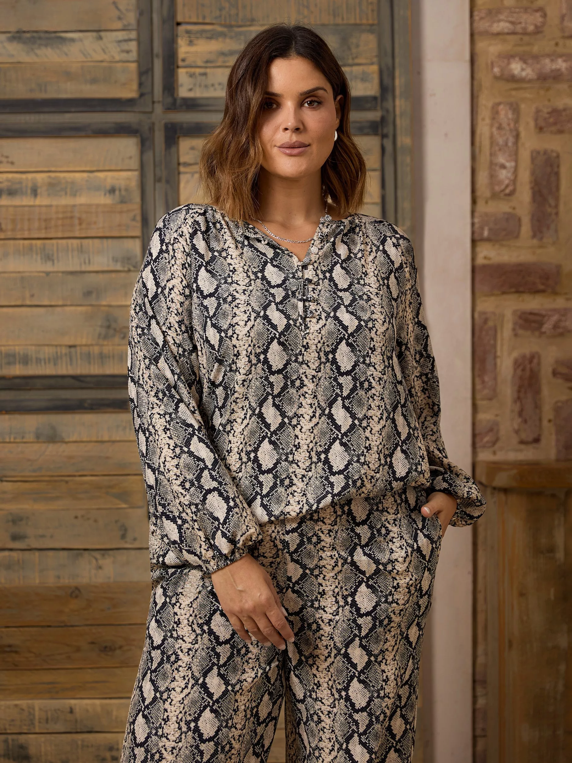 Cut from a gorgeous snake print woven fabric, this Button Front blouse is so comfortable, making you want to wear it time and time again. It has a gathered V neckline with a button fastening that is just so flattering to wear. The long raglan sleeves offer a beautiful movement and silhouette. It slips on easily over your head.