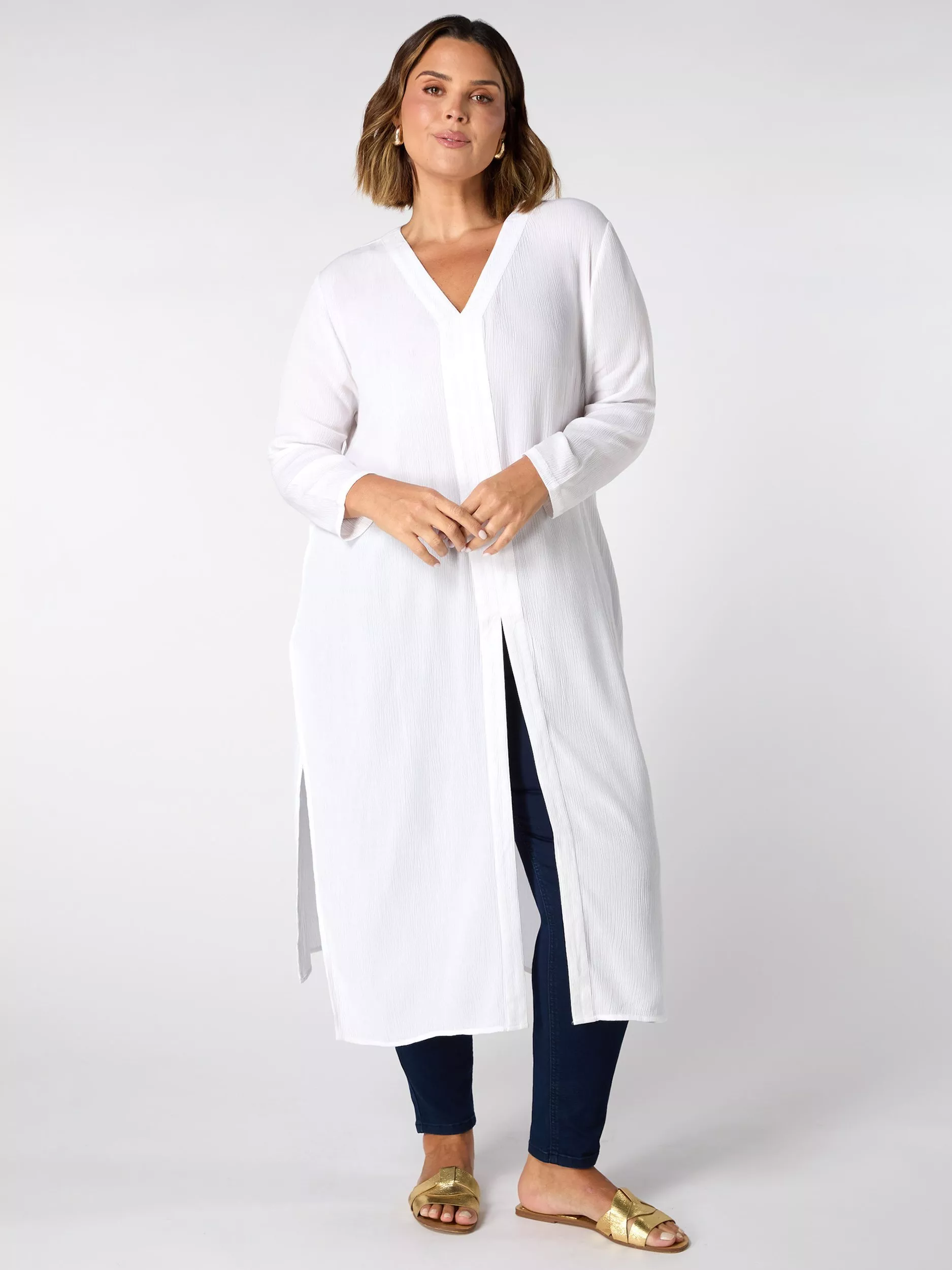 Easy to wear, this split front tunic from Live Unlimited is classic in cut with a v-neckline and long sleeves. Made from a light yet durable fabric, it is ideal when partnered with floaty midi skirts for summer days spent strolling around the city.