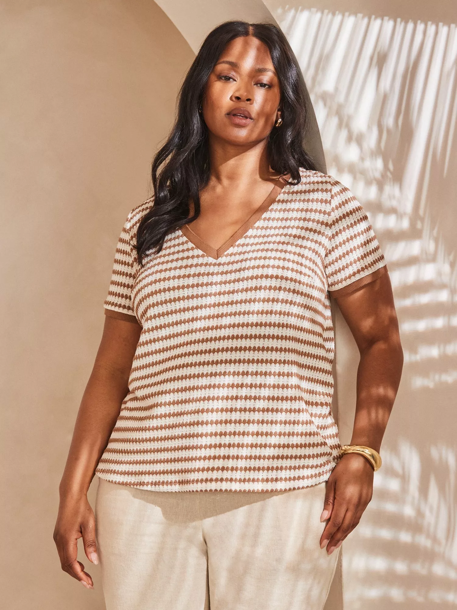 Made from a soft cotton blend, this crochet top from Live Unlimited Curve is framed with a v-neckline, short sleeves and stripes.