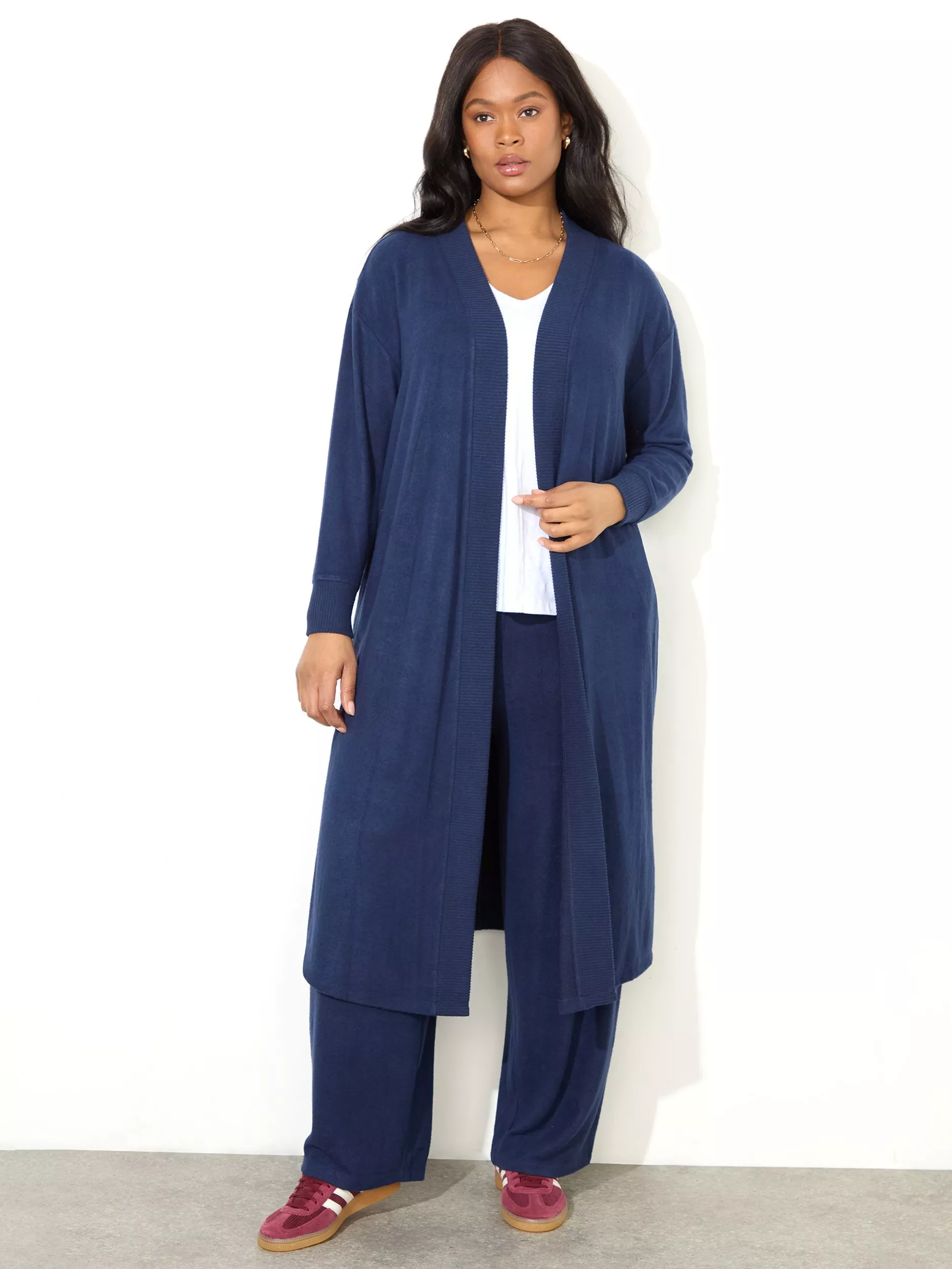 This super soft maxi length cardigan is cut from a jersey knitted fabric that is so comfortable to wear. The cuffs, hem and neckline have a ribbed detail, adding structure to the relaxed silhouette. It has an open front and dropped shoulder, making this a throw on piece.