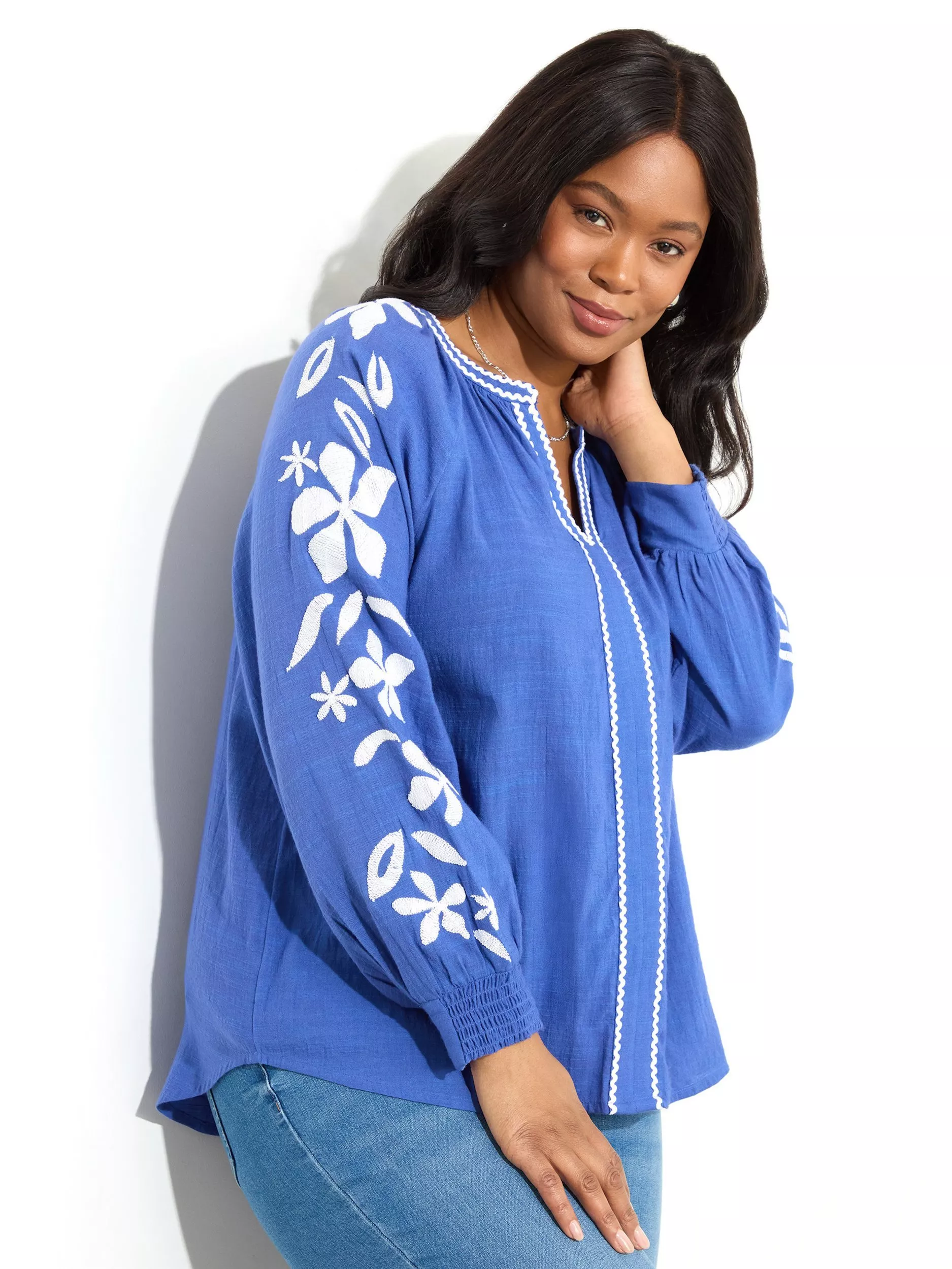 In a gorgeous viscose/cotton blend, this Embroidered Relaxed Blouse is a wardrobe essential and such a good transitional piece that will take you through the seasons. The contrast embroidery gives this blouse that extra detail, making it look so elegant. It has a flattering V neckline with a contrast trim, and the long raglan sleeves offer a beautiful silhouette. It slips on easily over your head and looks great styled with jeggings.