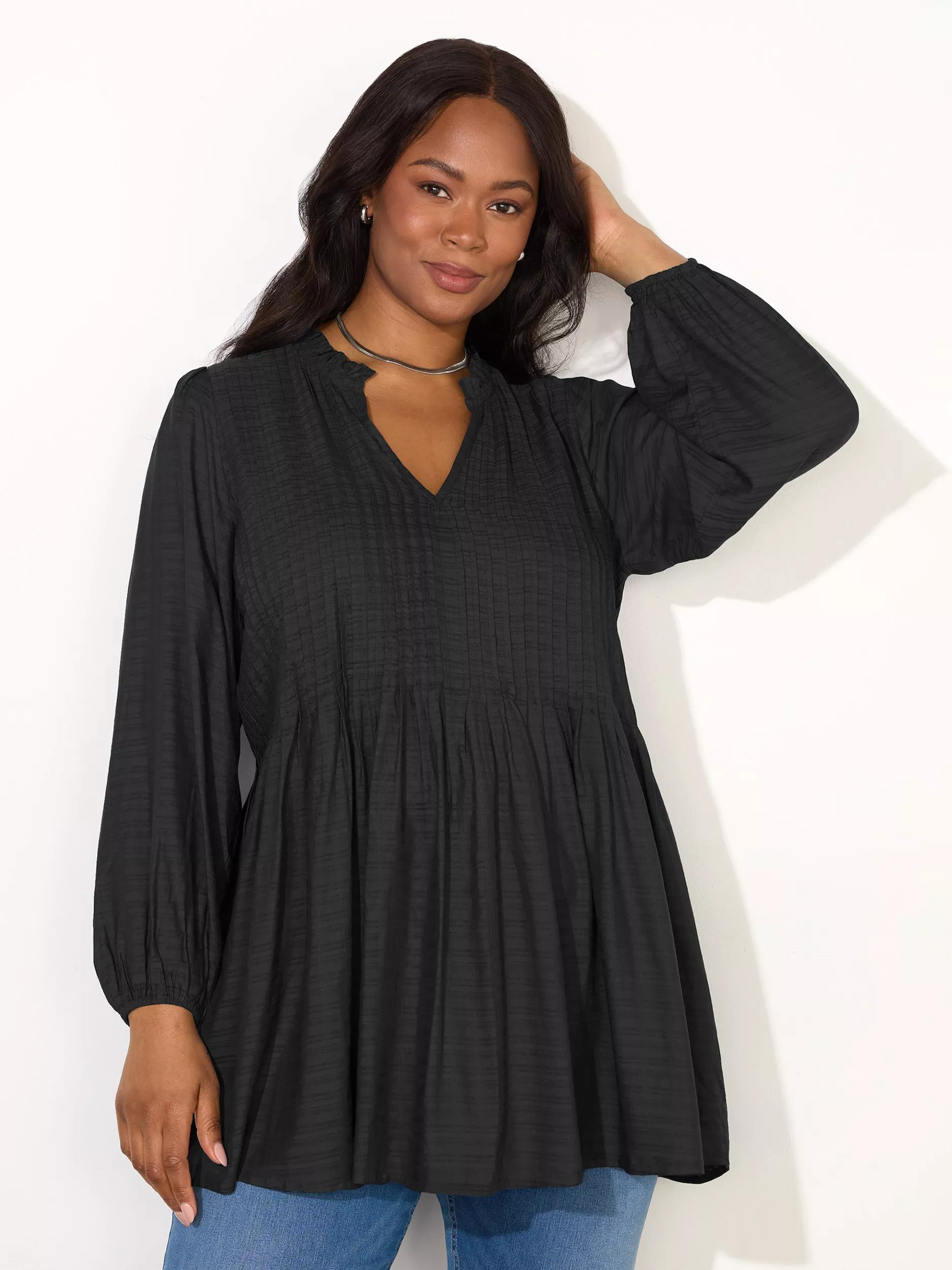 Longer in length for relaxed days ahead, this tunic top by Live Unlimited is free-from-fuss for timeless appeal. Framed with a classic v-neckline and long sleeves, it is made from soft viscose with pintuck detailing.