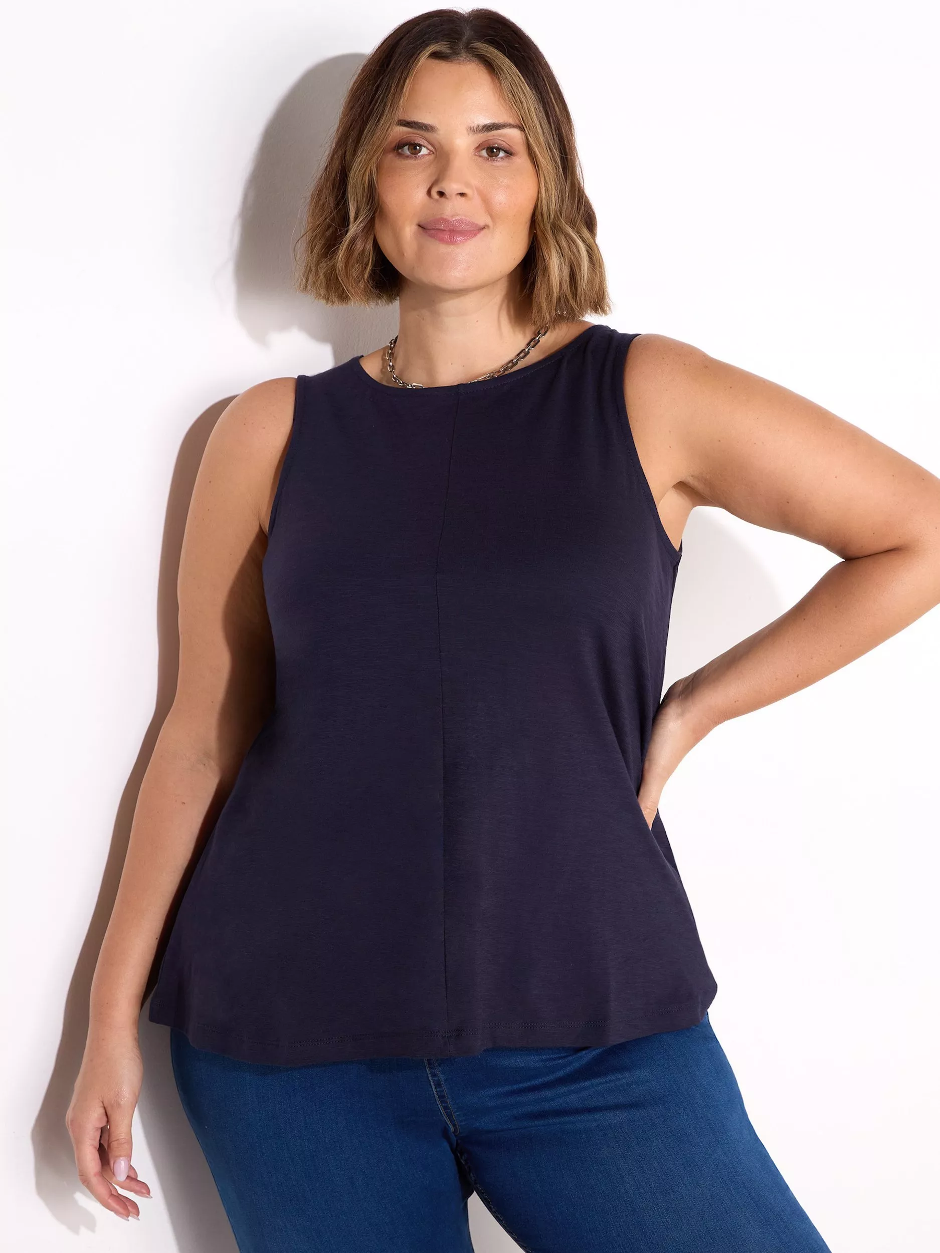 Cut from a textured cotton slub jersey this vest is a wardrobe staple and one that you'll want to wear for years to come. It has a flattering round neckline and the sleeveless design offers a gorgeous silhouette for this vest. It slips on so easily over your head and looks great styled with any leggings or jeggings depending on the look you want to create.