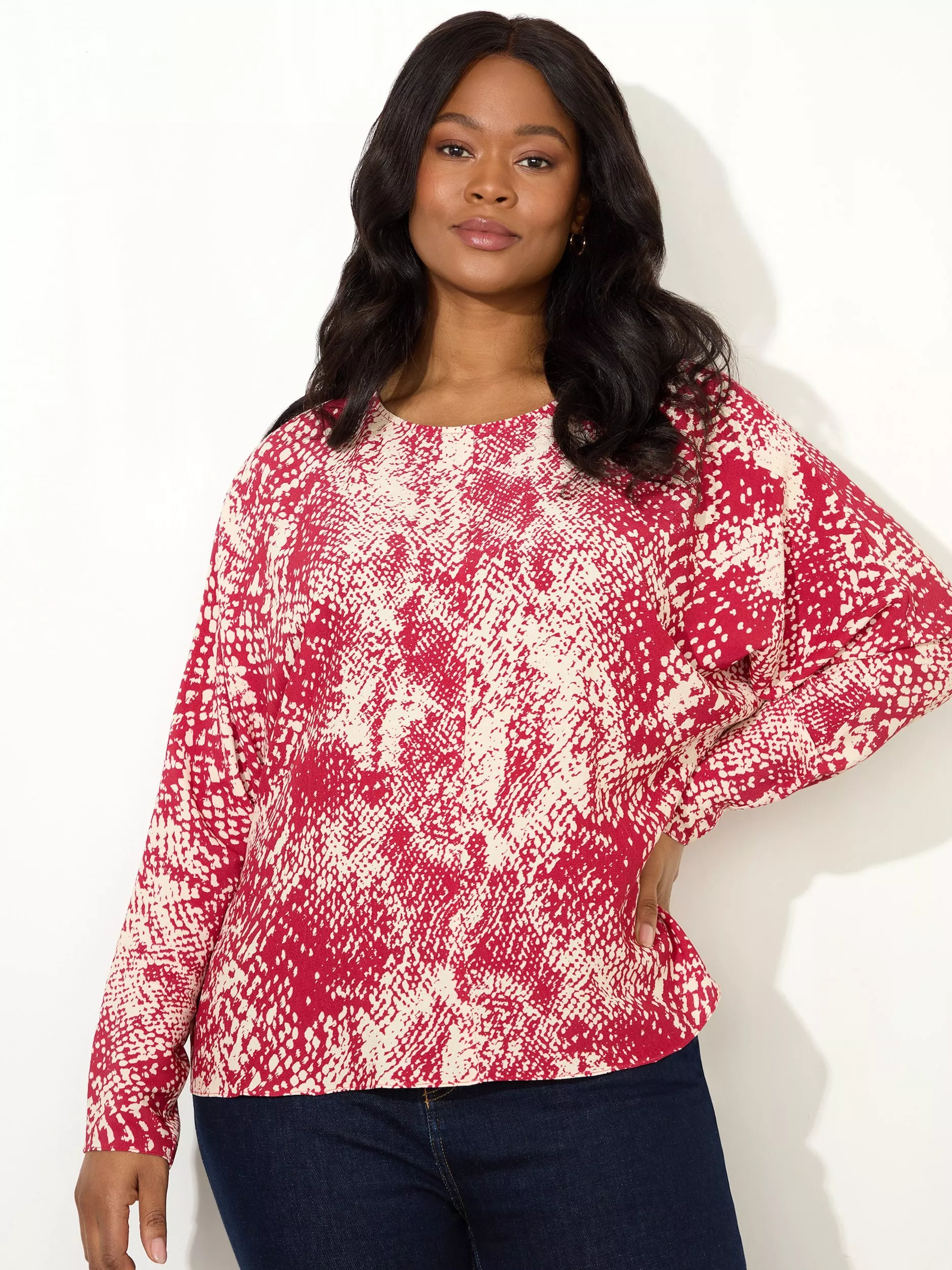 Cut from a Snake Print made from a soft viscose fabric this Dolman Sleeve Blouse is a wardrobe essential and just looks so elegant. The gorgeous Snake Print elevates this blouse so much and adds that extra detail. It has a flattering crew neckline and the long dolman sleeves offer a gorgeous silhouette. It slips on easily over your head and looks great styled with Navy Jeggings.