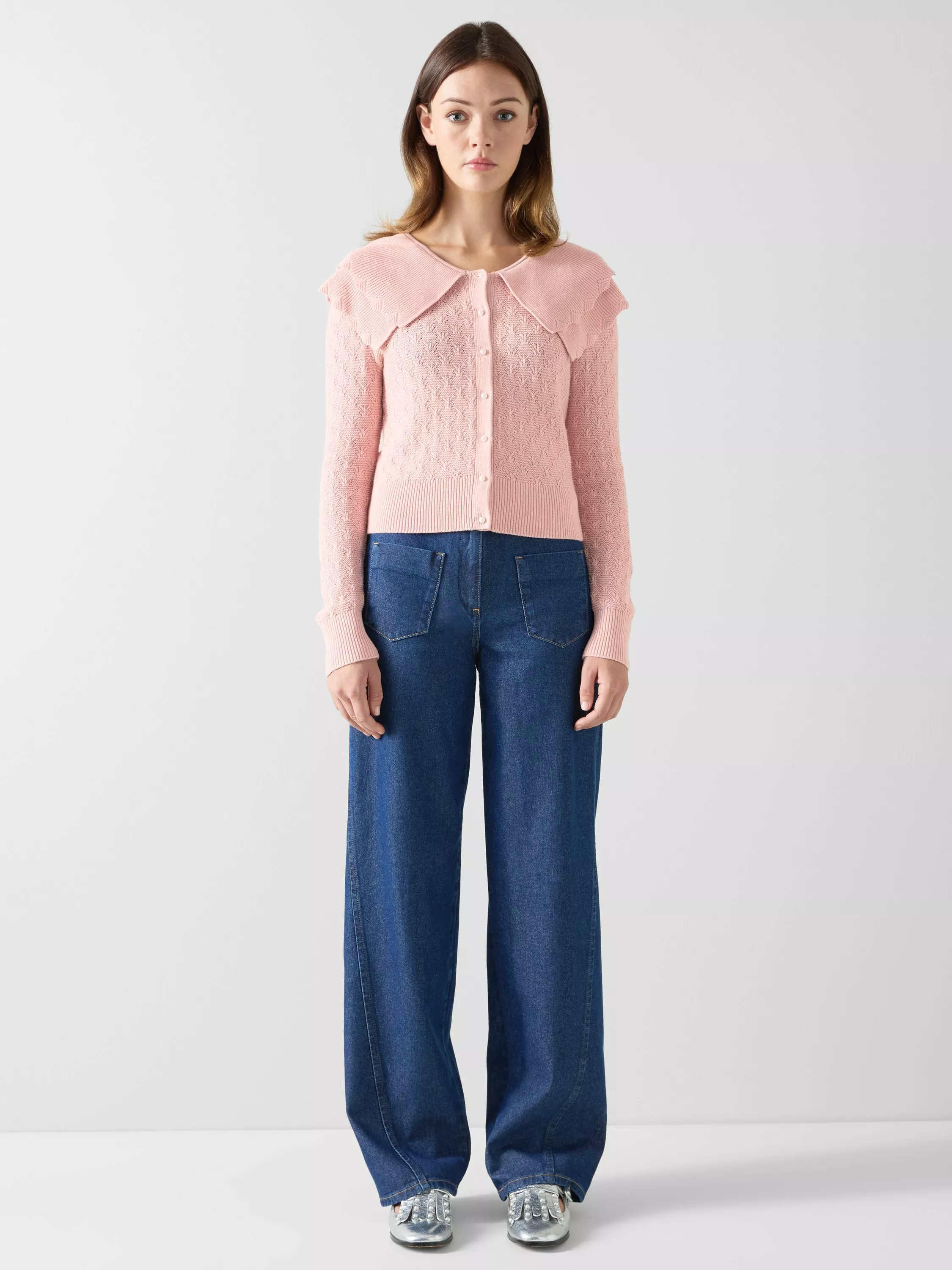 Part of the LKB London collection, this pointelle cardigan brings modern polish within reach. With an oversized double collar, long sleeves, and a button-down front, pair it with wide-leg denim or trousers for a contemporary, effortless look. Soft, textural and versatile, it’s a refined everyday essential.