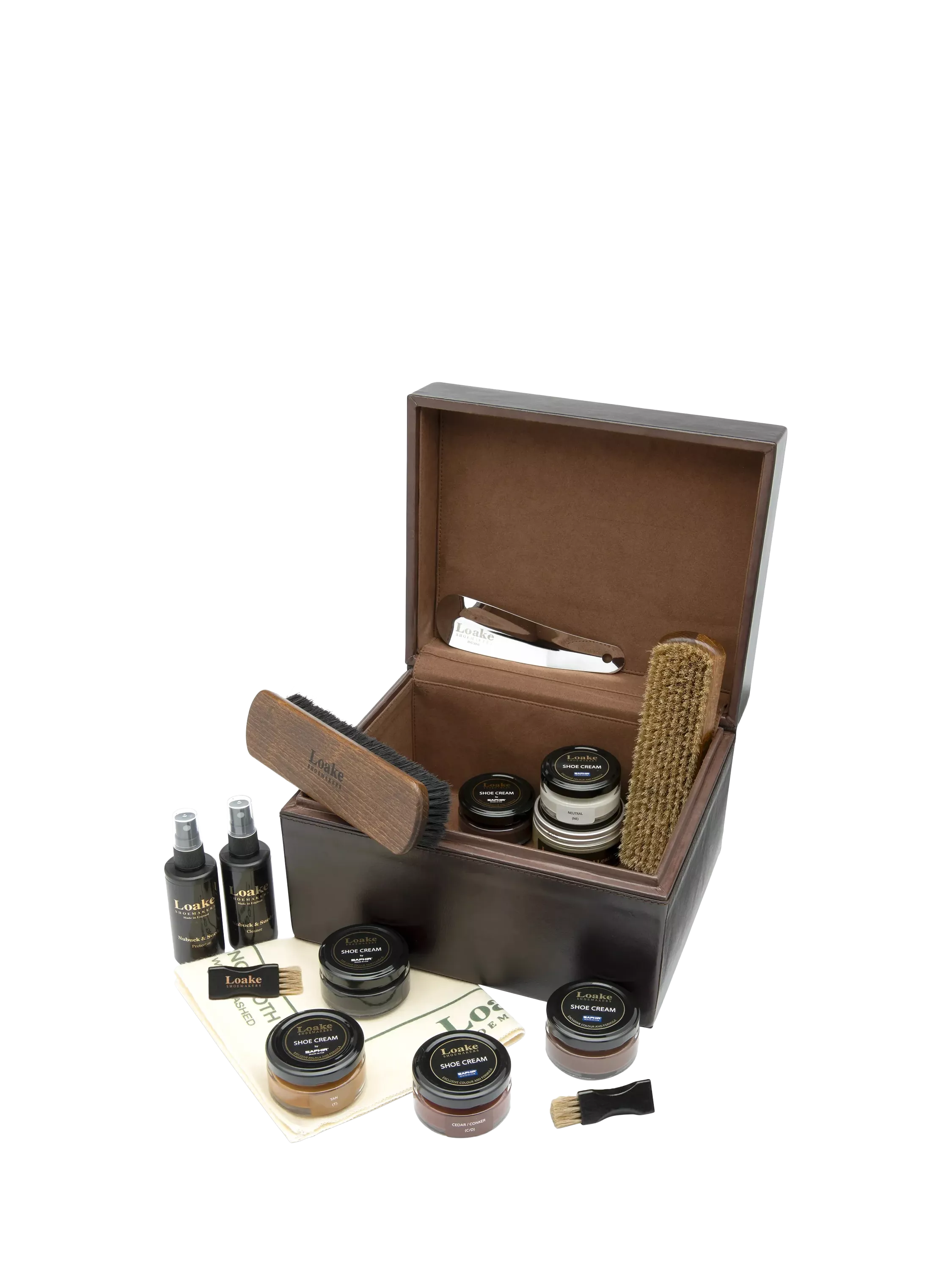 This comprehensive shoe care kit includes a cleaning cloth, metal shoe horn, oiled/waxy leather protector, suede cleaner, and suede protector. It also features six Saphir/Loake shoe creams in Black, Brown, Dark Brown, Conker Brown, Tan, and Neutral, alongside two large polishing brushes and two small applicator brushes.