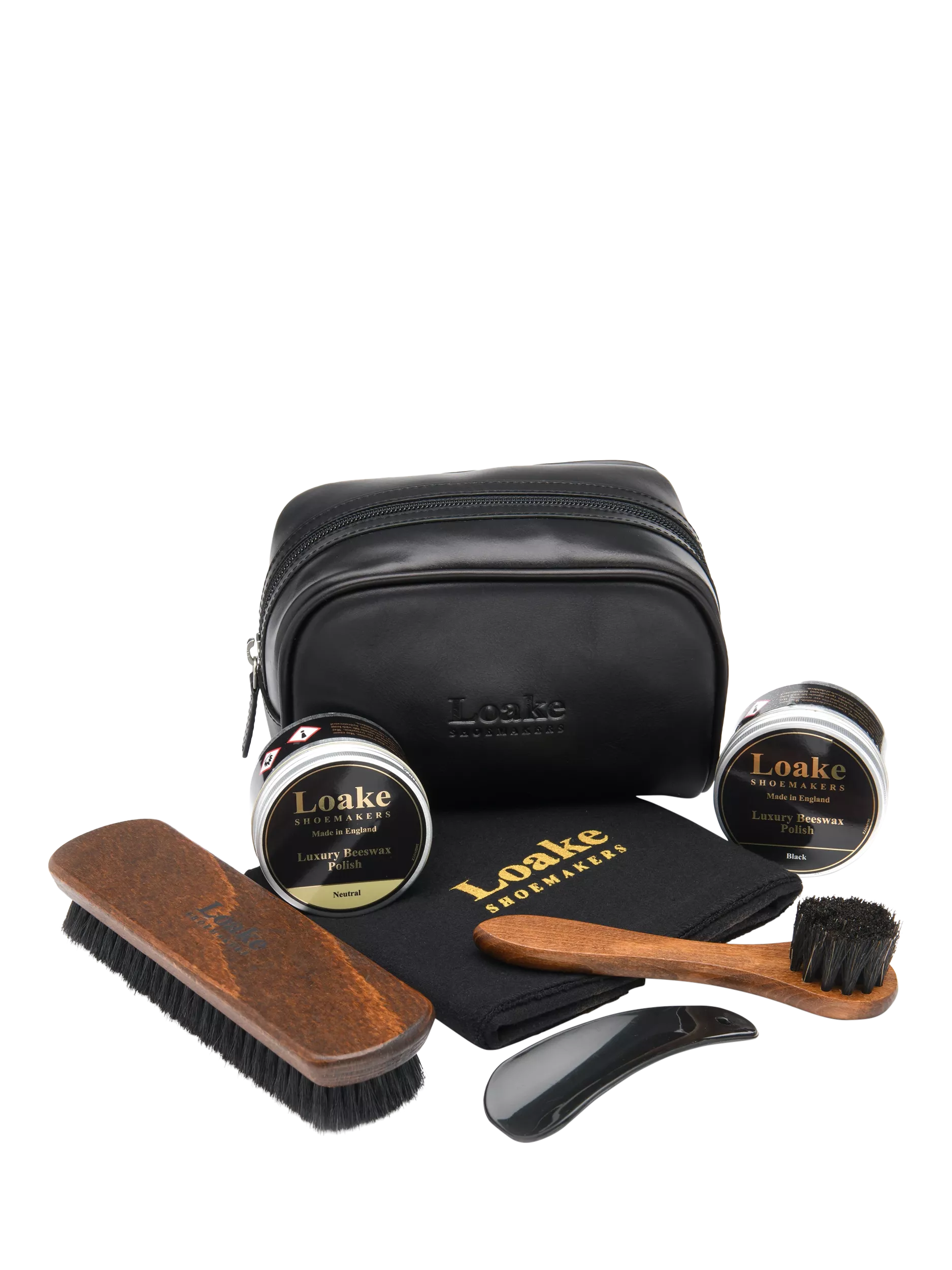 Inside the Loake-branded black leather pouch, you’ll find black and neutral beeswax polishes to restore colour and shine, two wooden-handled brushes for precise application and buffing, and a soft duster cloth for a flawless finish. A small shoehorn is also included, helping to protect the heel structure of your shoes when putting them on.