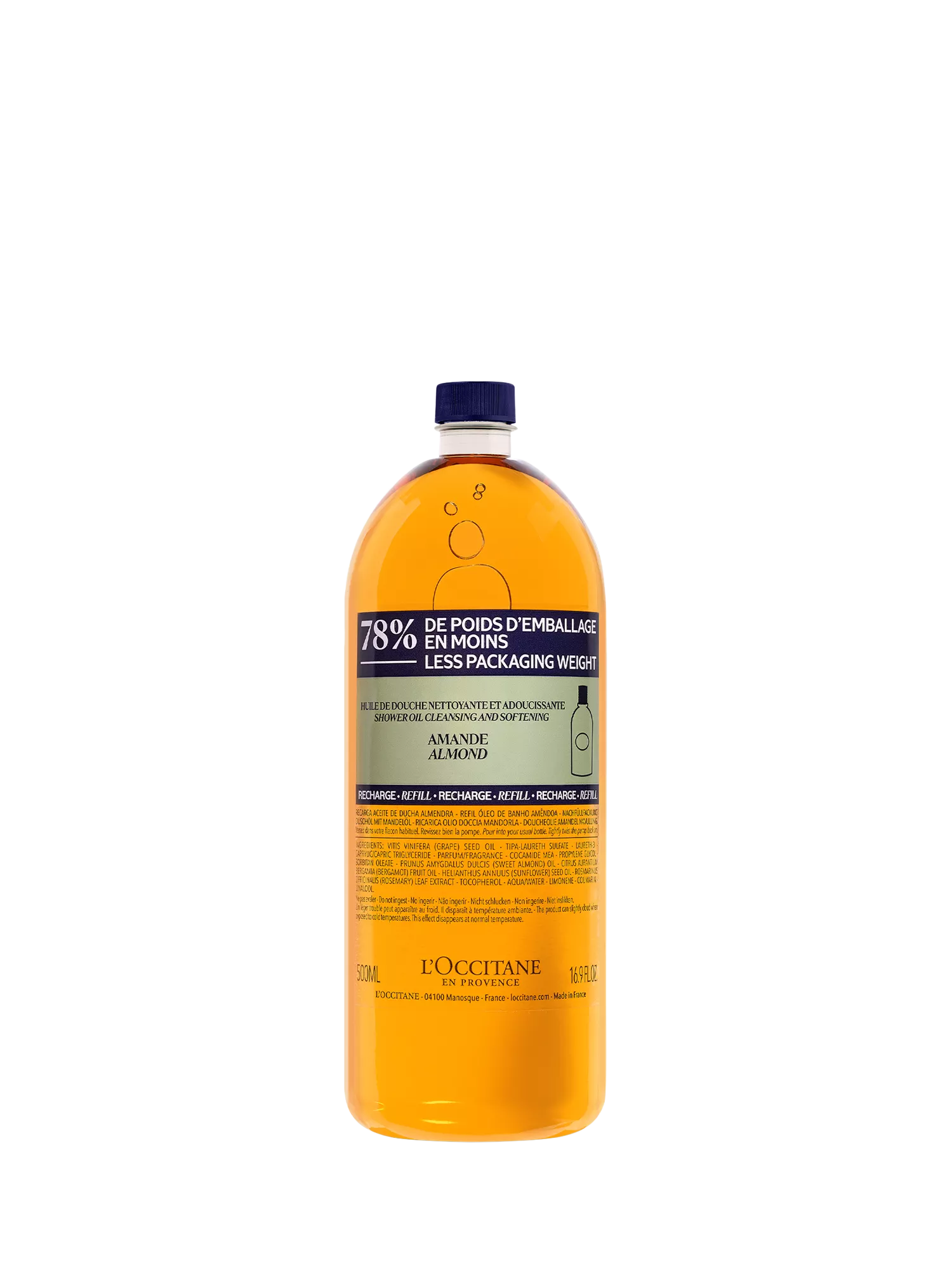 This Almond Shower Oil Refill transforms, when in contact with water, into a delicate foam that gently cleanses the body. Enriched with almond oil, it respects the hydrolipidic film and leaves a subtle and mouthwatering scent of fresh almond, for a delightful skin!