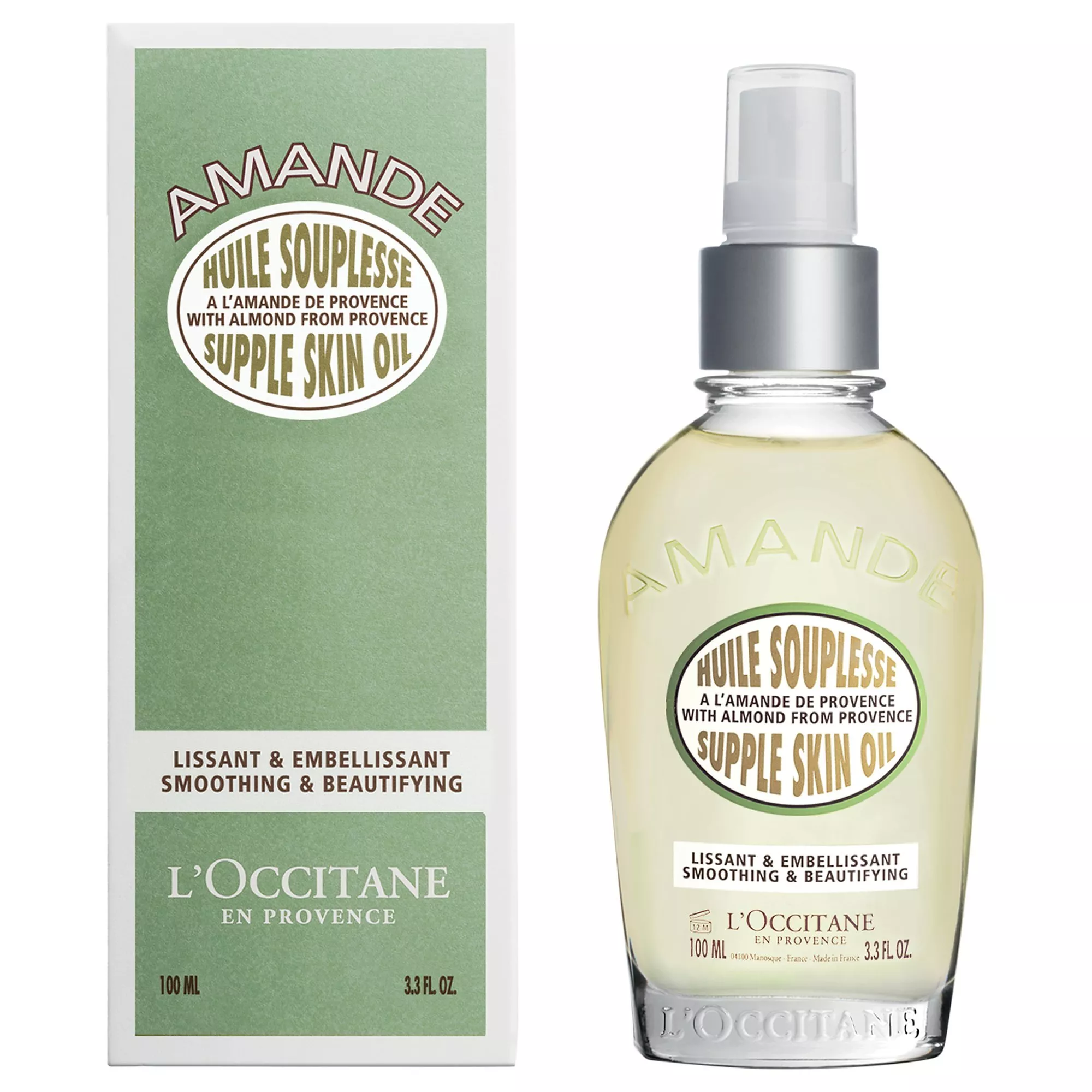 Our Almond Supple Skin Oil is made with over 50% pure almond oil from Provence. Lightweight in texture, this delicious oil helps fight dryness and skin slackening. Our special blend of almond oil, high in omega 6 and camelina oil, high in omega 3, leaves skin superbly nourished and supple, whilst silicium extract helps firm and tighten. It leaves skin soft, supple and with a beautiful, smooth-as-satin finish.