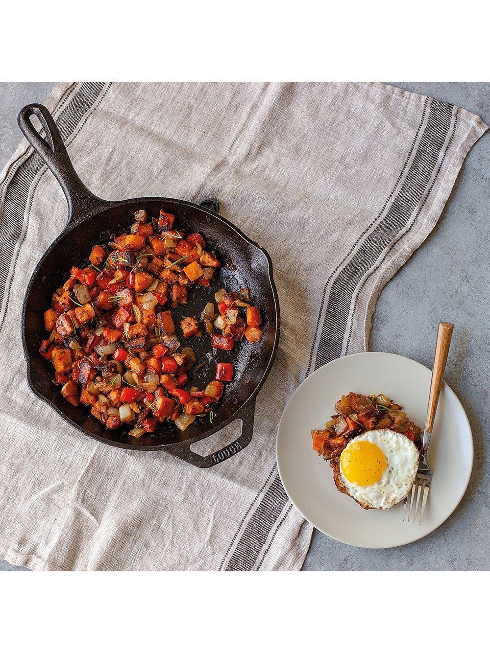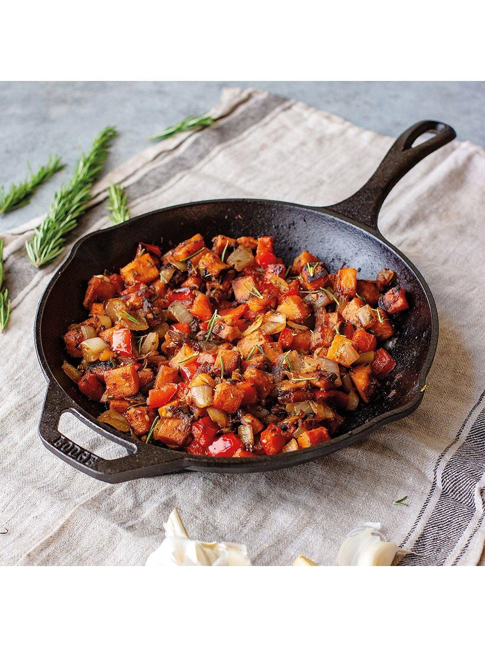 From Lodge Cast Iron in Tennessee, USA, the pan can handle high temperatures and is extremely hard-wearing. It won't dent, bend or warp and it's even safe to use with sharp metal kitchen tools. Cast iron distributes heat evenly across its surface and it retains heat so you can start cooking on the hob or stove and finish it in the oven. It's also ideal for oven-to-table serving using the handle and carry handle. Just make sure to use a pair of oven gloves.