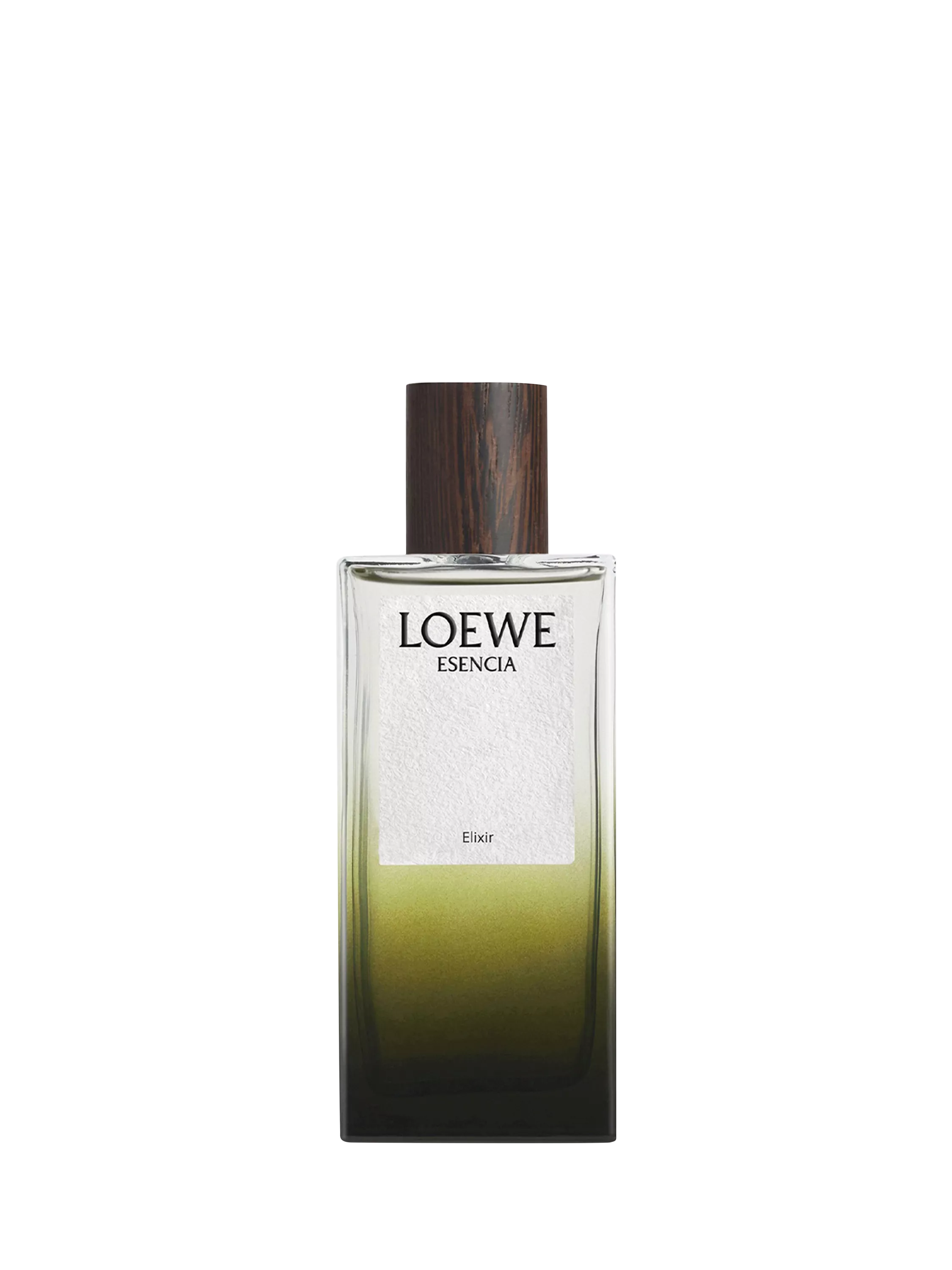 LOEWE Esencia Elixir Eau de Parfum comes encapsulated in a glass flask in a gradient of green, echoing the bottle of its original iteration, and finished with a wooden cap.
