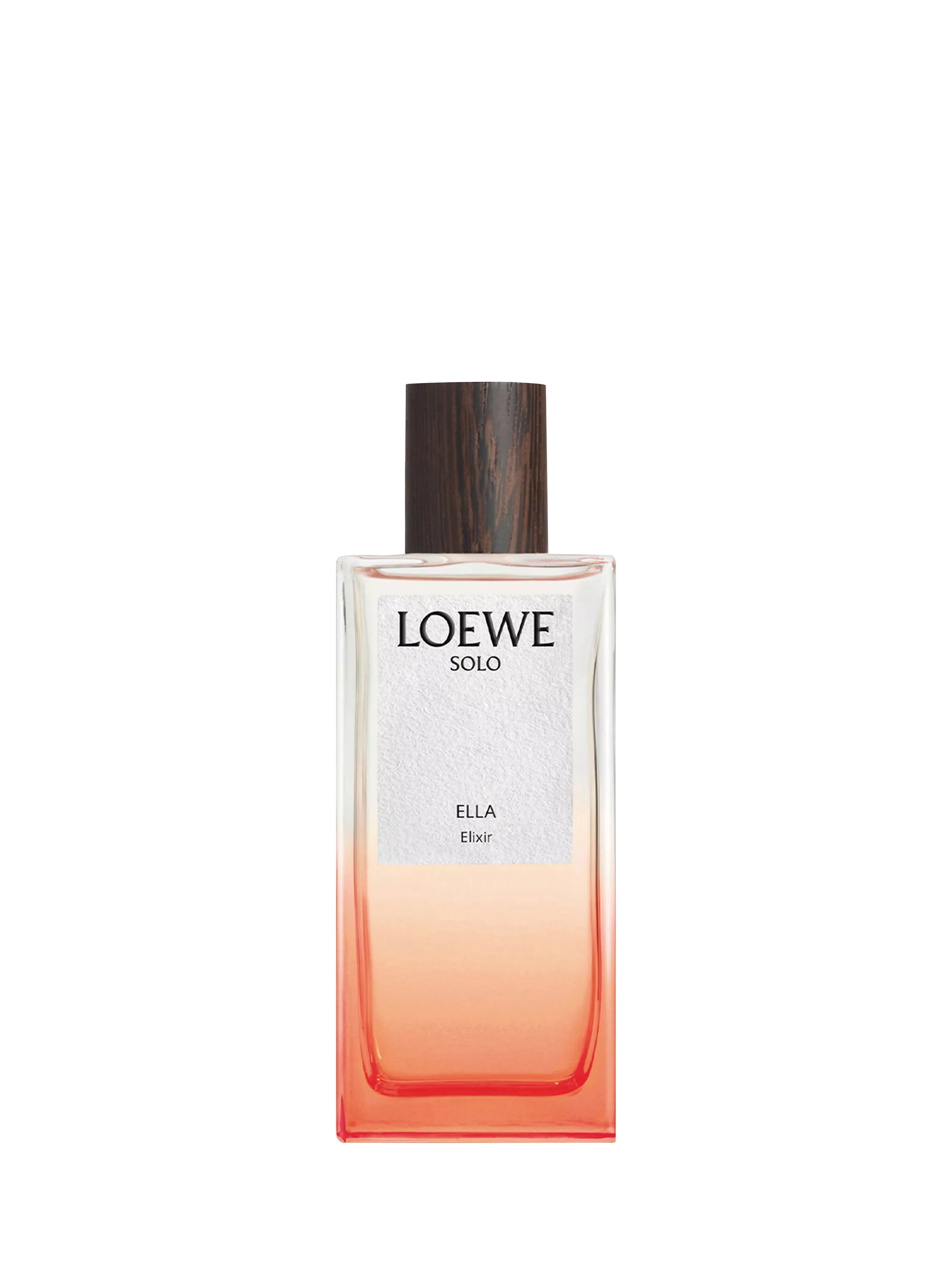 LOEWE Solo Ella Elixir Eau de Parfum comes encapsulated in a glass flask in a gradient of orange, echoing the bottle of its original iteration, and finished with a wooden cap.