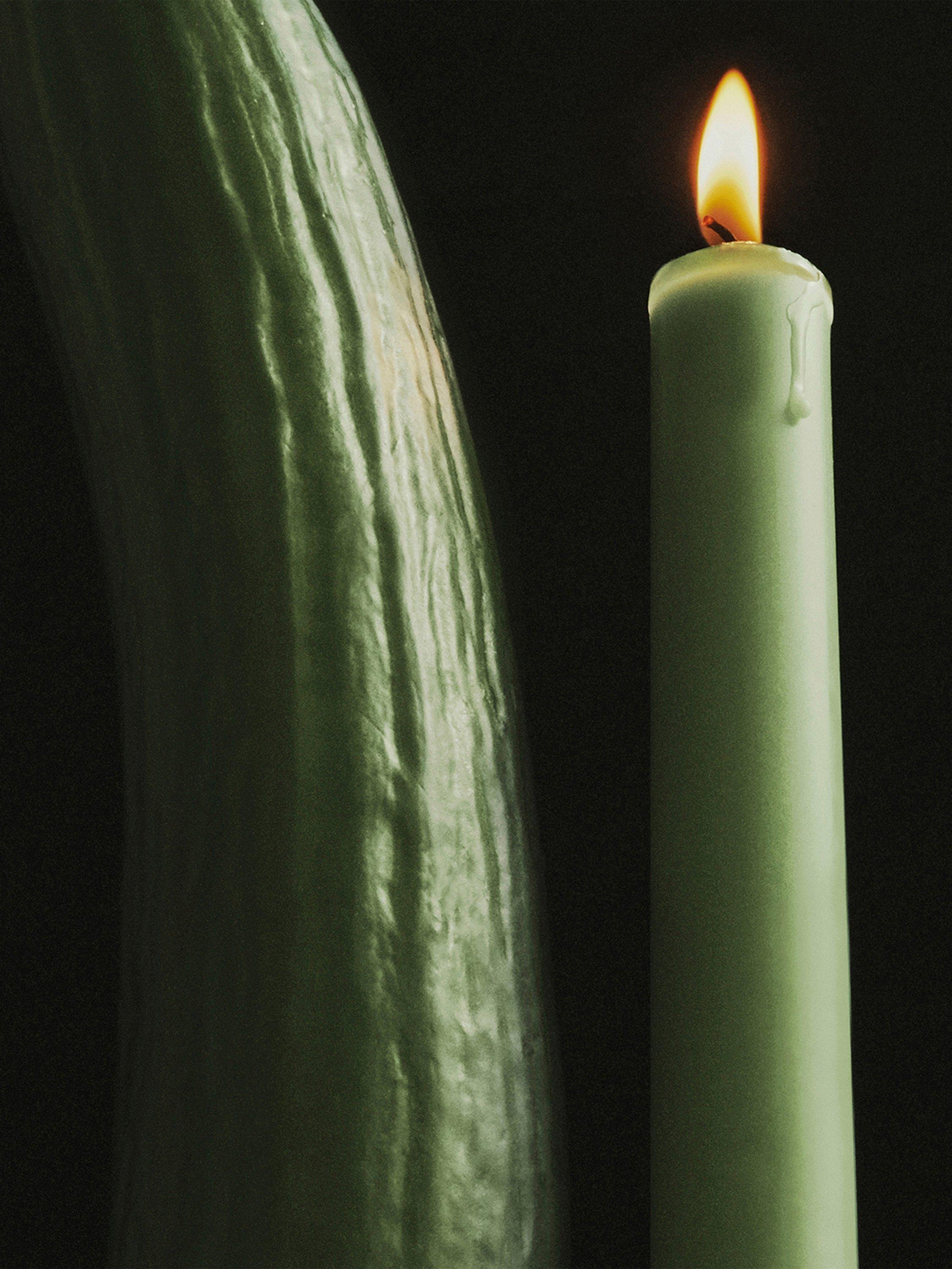 A candlestick-shaped candle, crafted in wax, with ivy essence.
