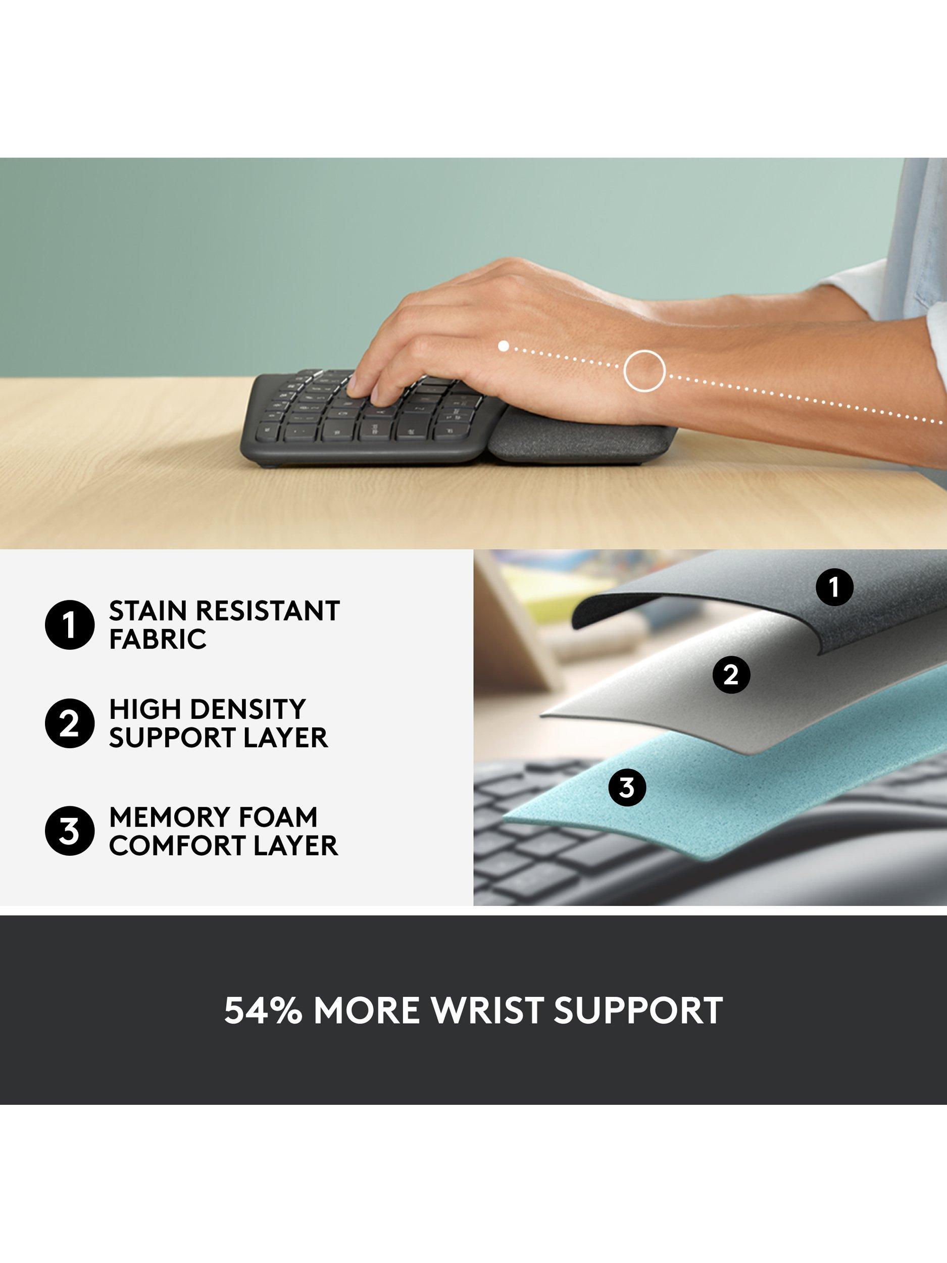 The handy curved, split key frame reduces muscle strain on your wrists and forearms, whist the pillowed wrist rest offers comfort during extended usage.