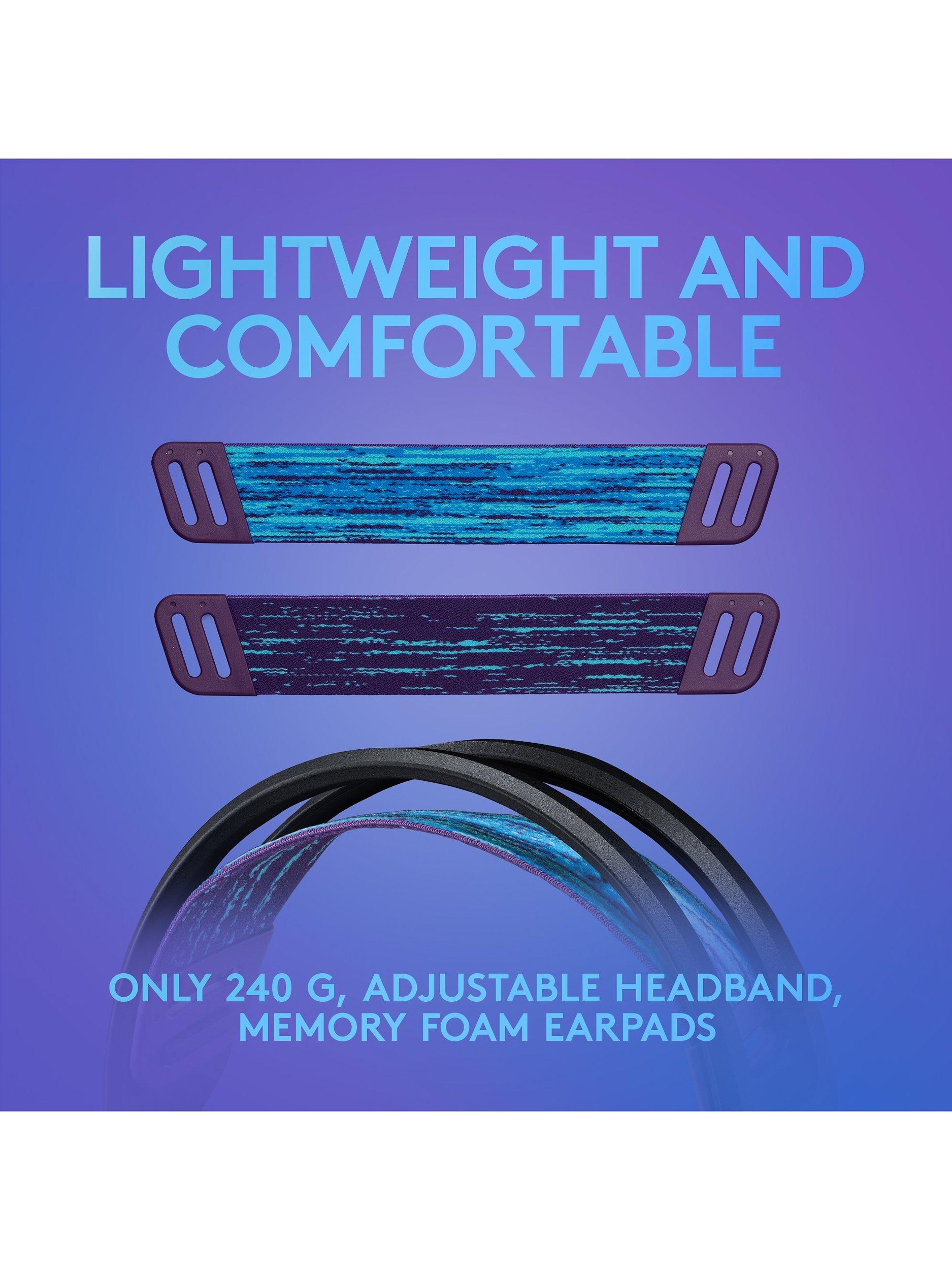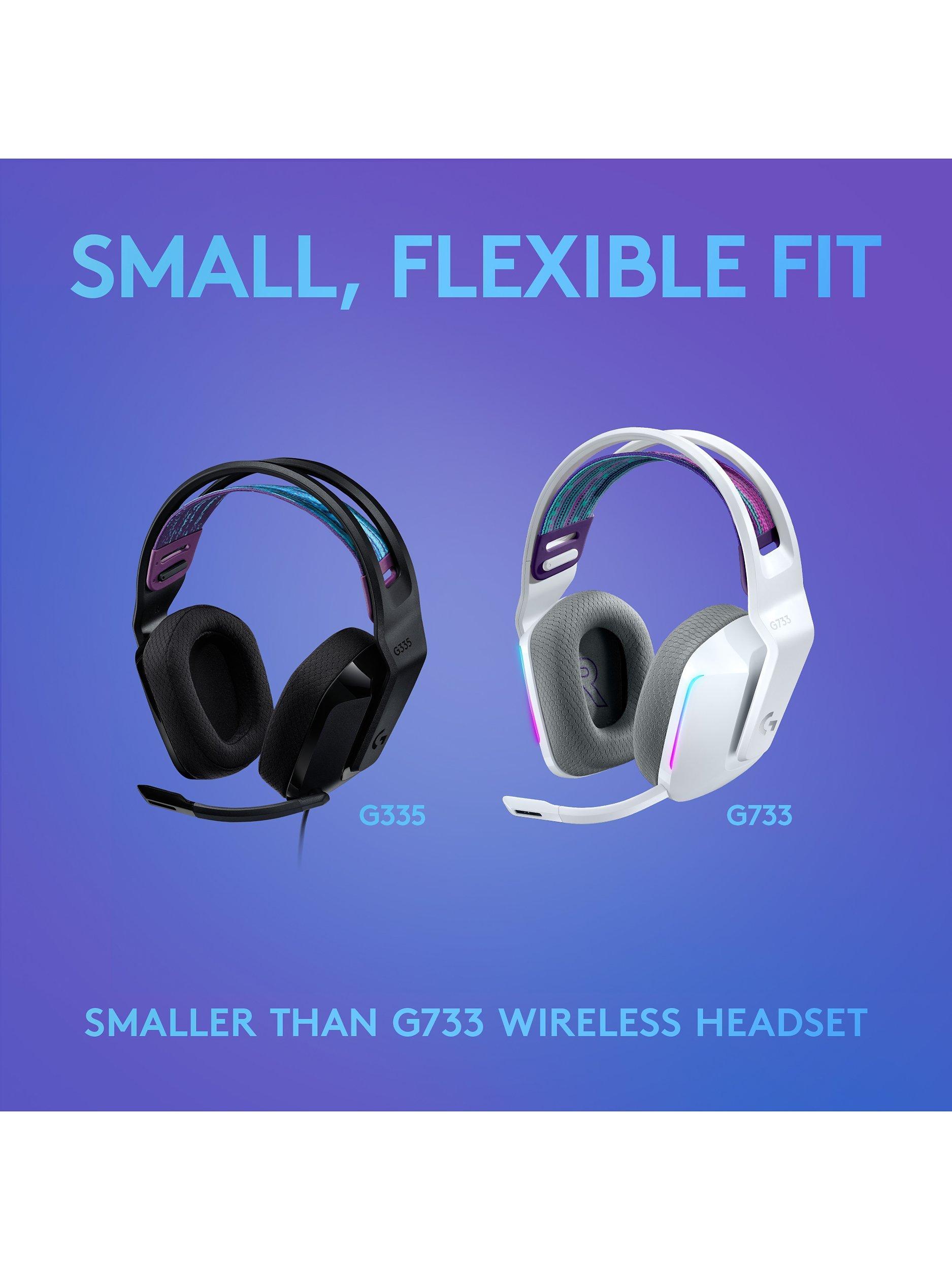 At only 240 grams, G335 is a smaller and lighter version of the award-winning G733 LIGHTSPEED wireless headset. The suspension headband design distributes weight and relieves pressure points. Soft, breathable memory ear cups and sports mesh material surround the ear and provide just the right amount of force to stay firmly in place.