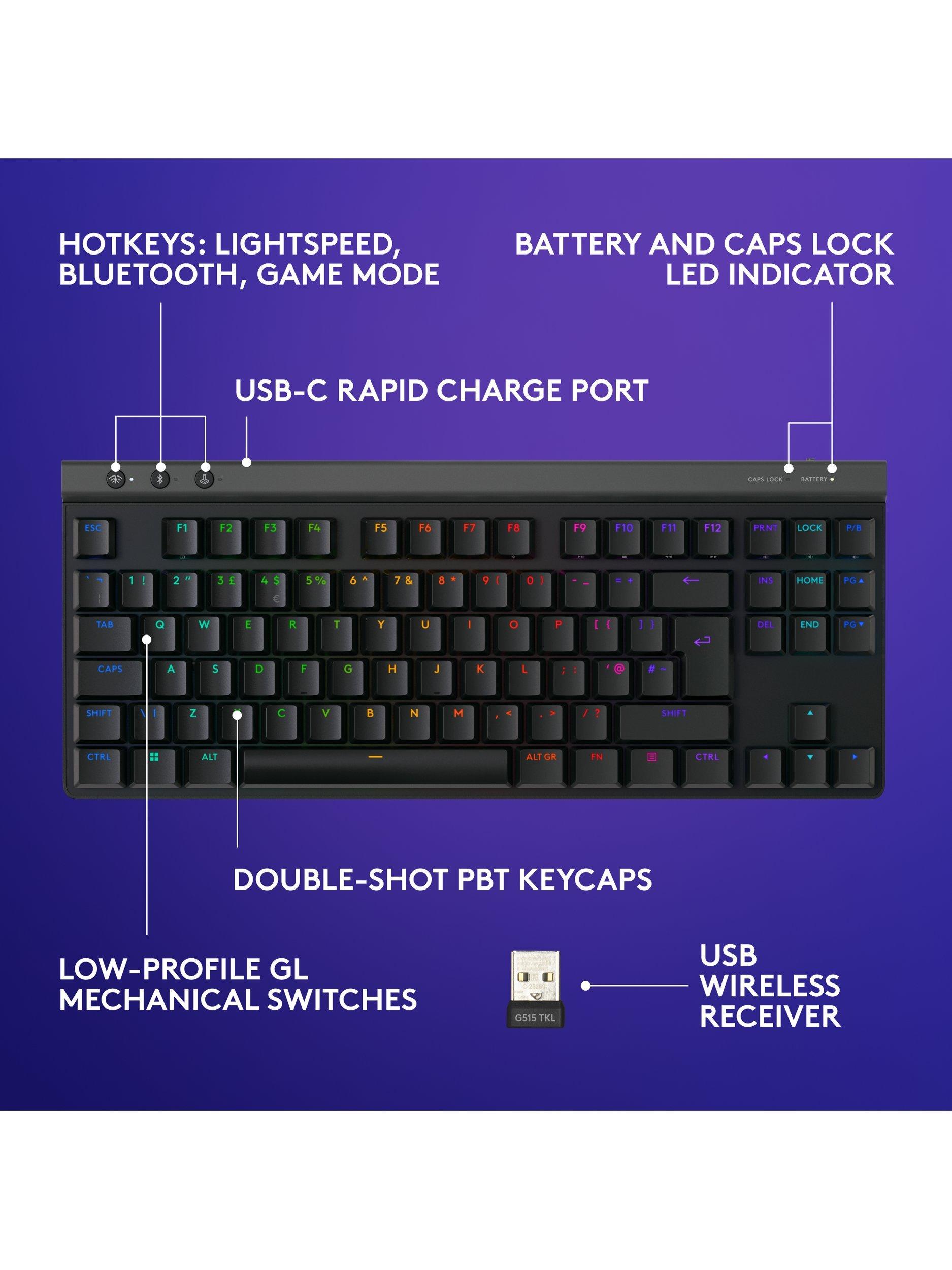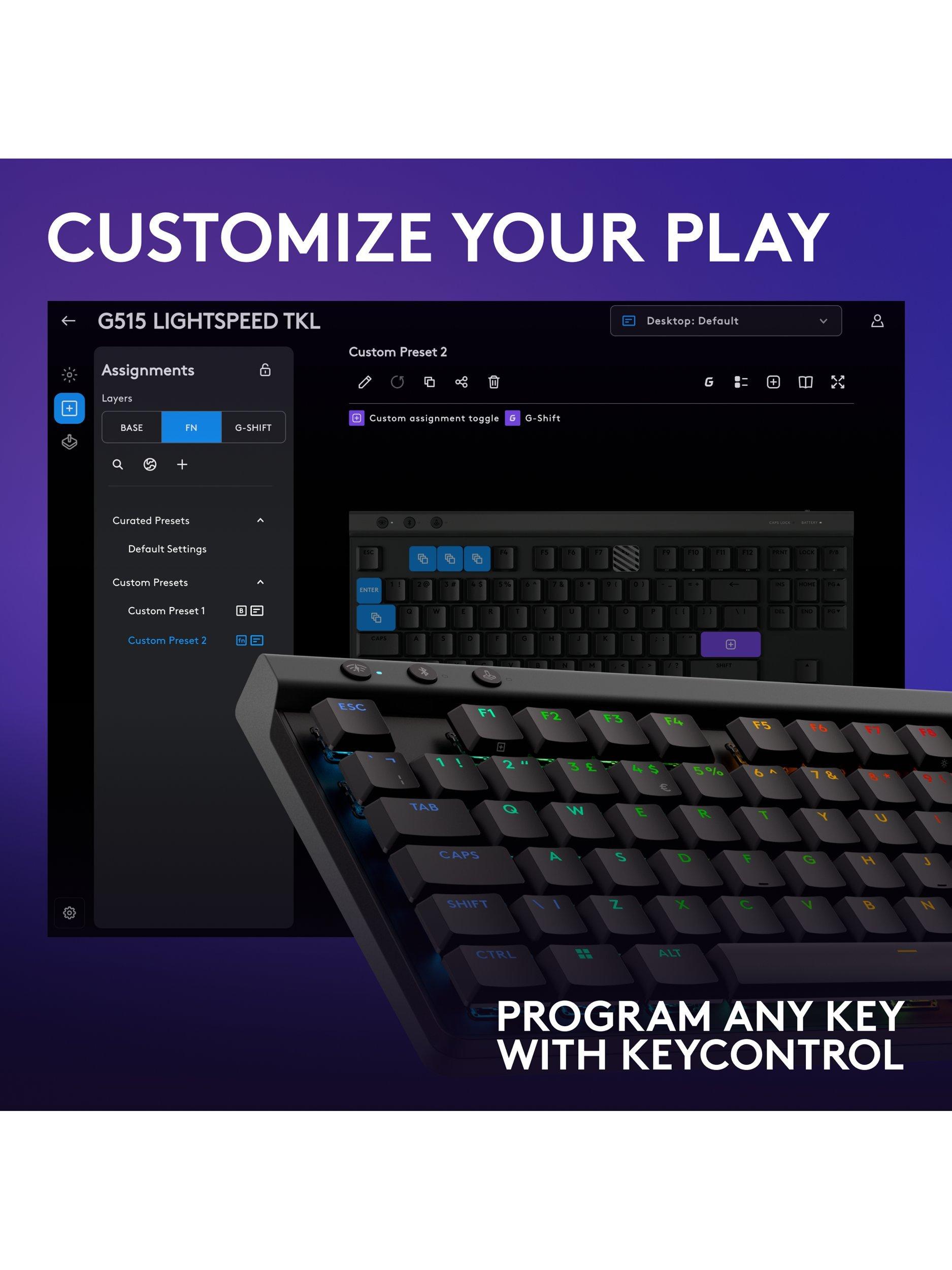 Ultra-thin design meets high-performance engineering with Logitech’s G515 Lightspeed TKL keyboard. Suit your way of play with tri-mode connectivity and KEYCONTROL. GL mechanical switches and double-shot PBT keycaps offer durability without compromise to accuracy.