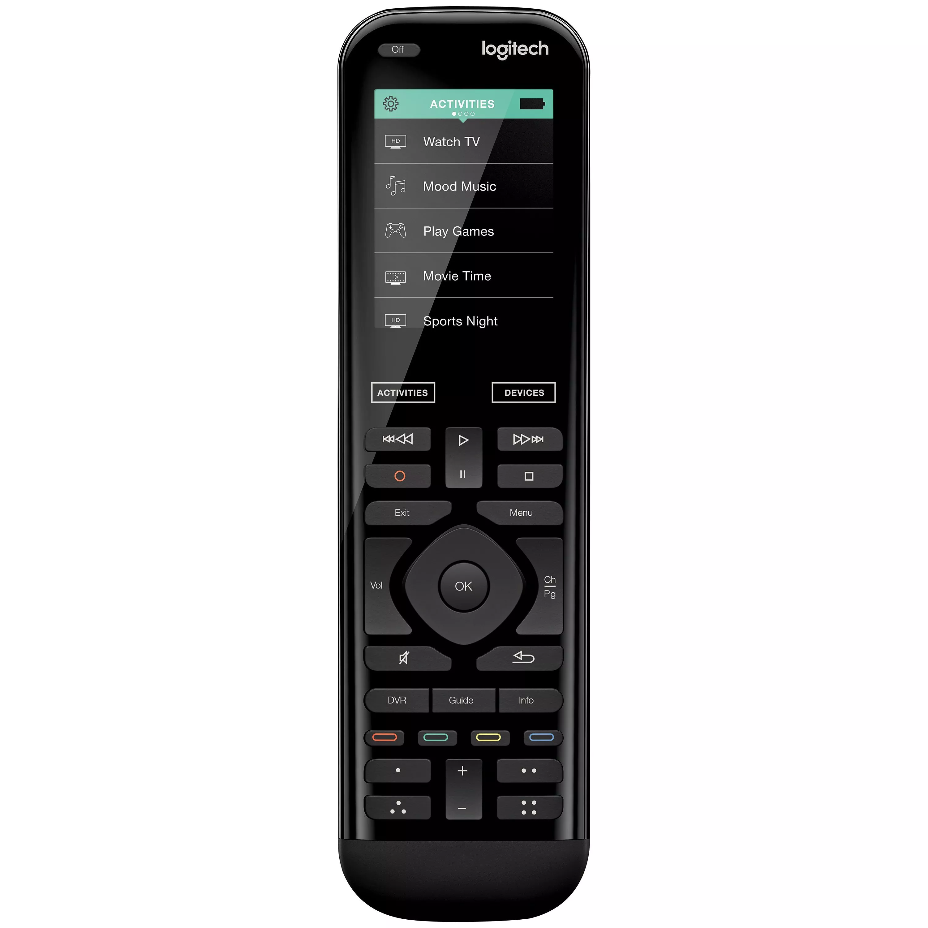 Tap a custom activity like ‘Watch TV’ or ‘Movie Time’ and watch all the linked devices power up and switch to the right settings simultaneously. You’ll no longer have to fiddle with a pile of remotes, as you get your devices ready at the touch of a button. You can turn your heating up*, dim the lights*, control your TV, DVD, Blu-Ray or music units, and even teach the remote up to 950 new Infrared commands.