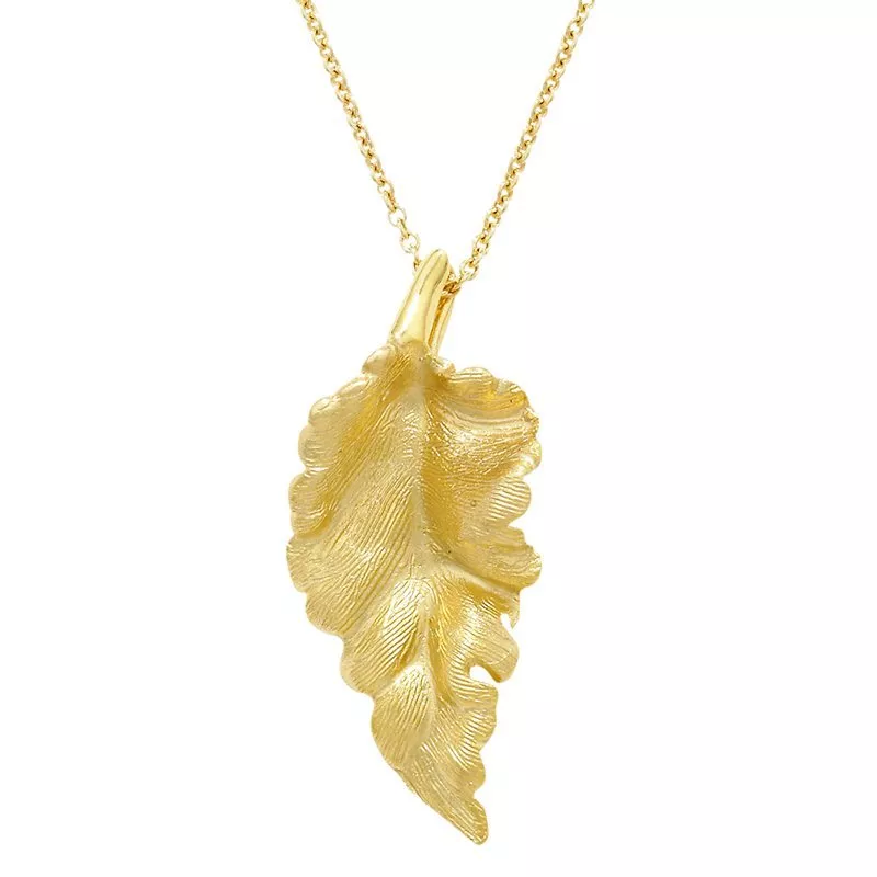 Solid, 9 carat rich yellow gold leaf with a textured finish and fluted edge, this pendant is 3cm long x 1.4cm at its widest. A 9 carat yellow gold chain slides through the leaf's stem.