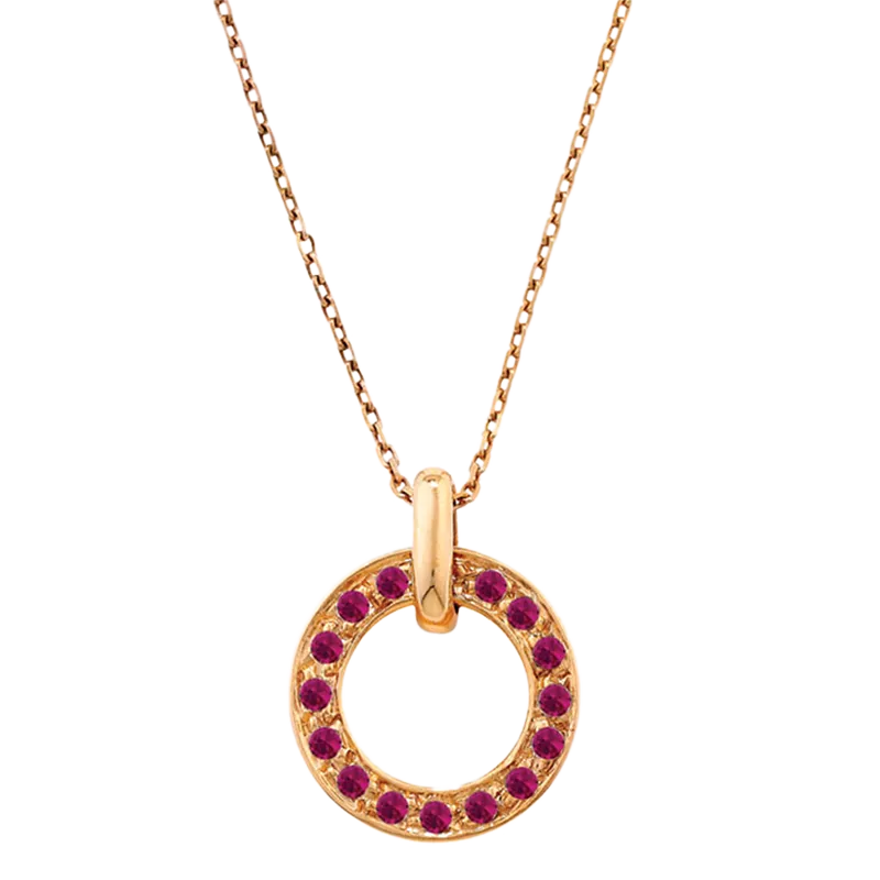 Crafted from solid gold, the necklace exudes elegance with its slim chain and small cut-out circle pendant. The pendant is set with 16 faceted round-cut precious stones. The necklace fastens with a lobster clasp.