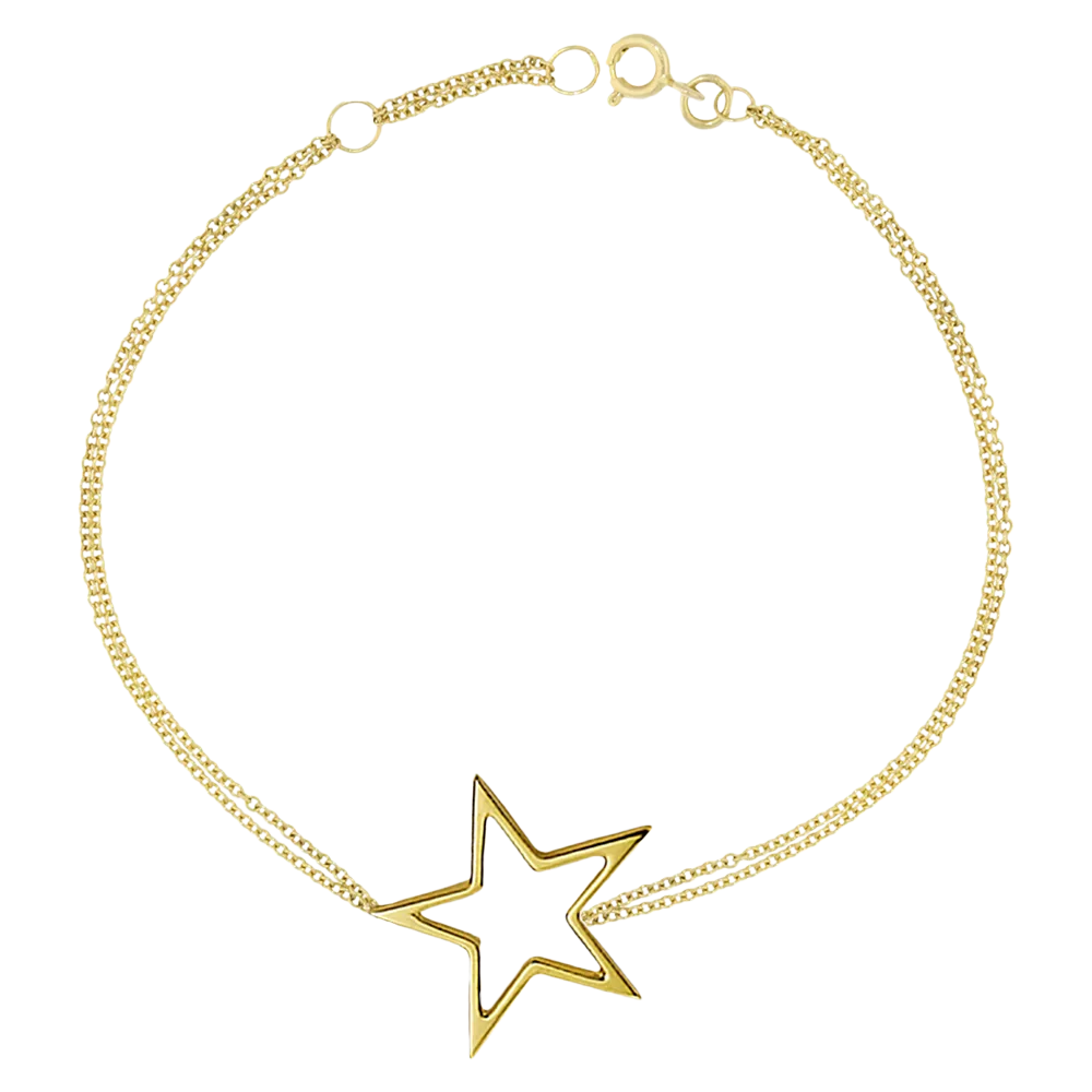 A simple 9ct gold double chain bracelet from London Road, set with a polished open star charm. Fastens with a spring-ring charm, with two jump-loops to wear the bracelet slightly shorter if preferred.