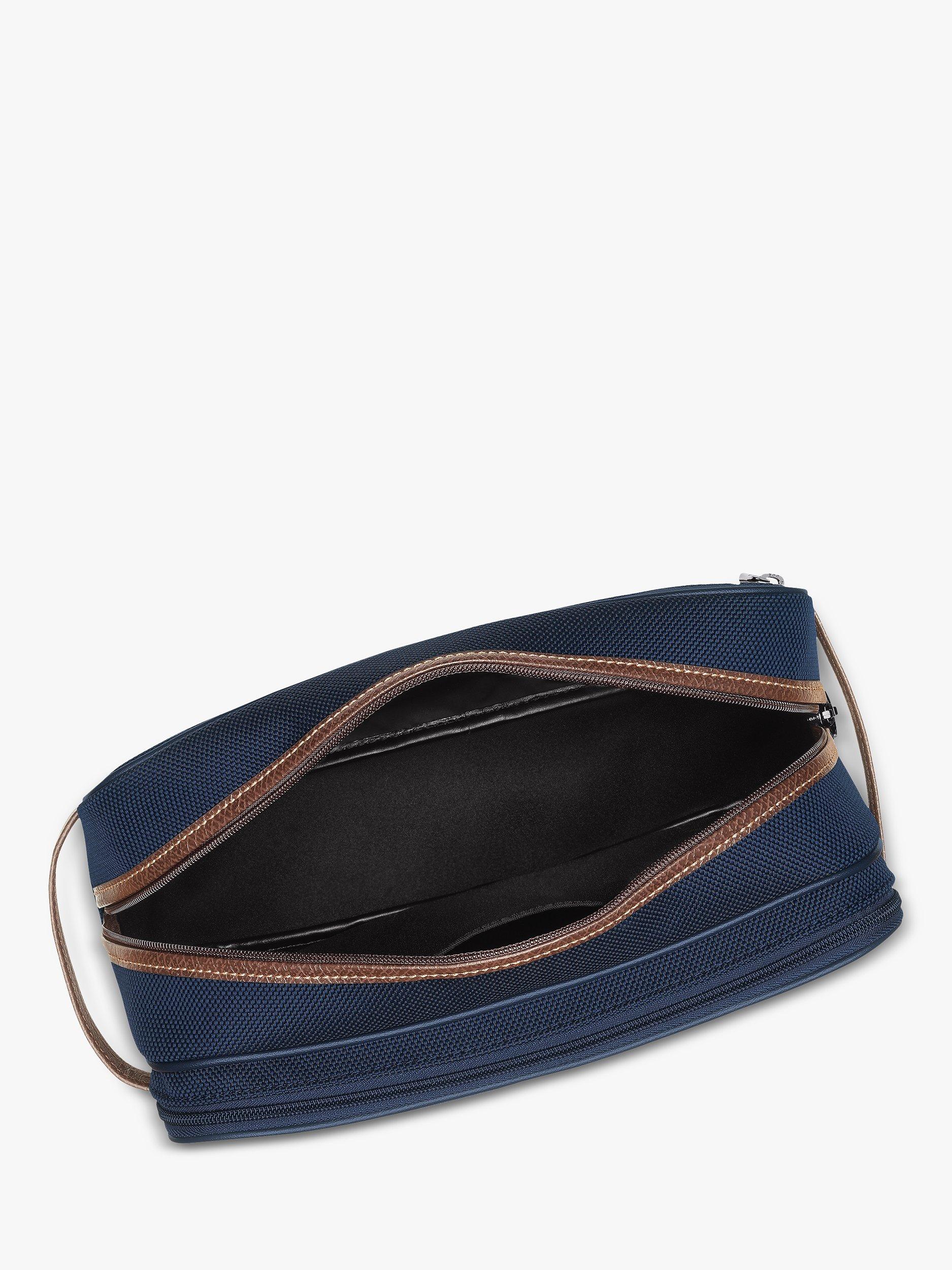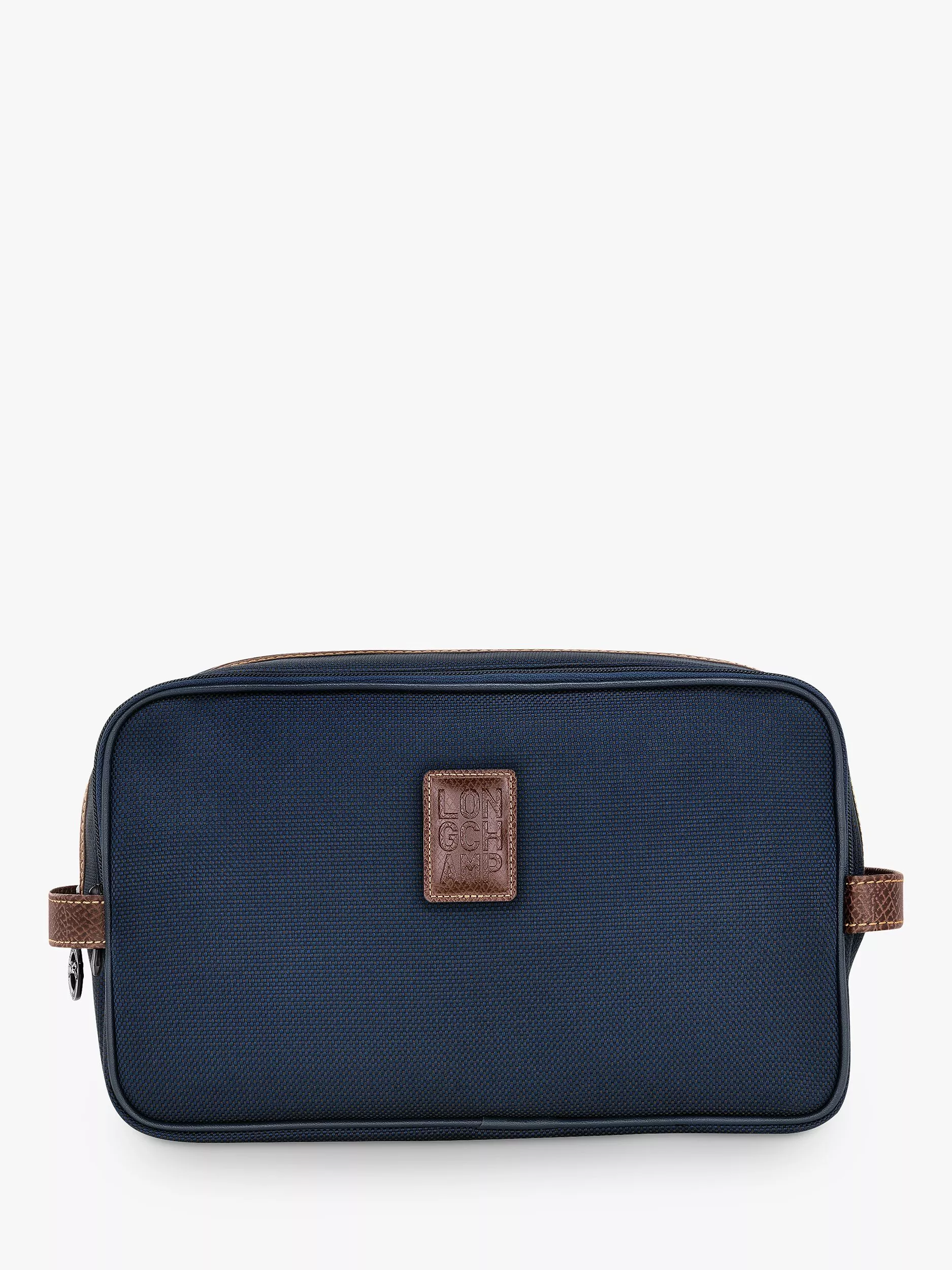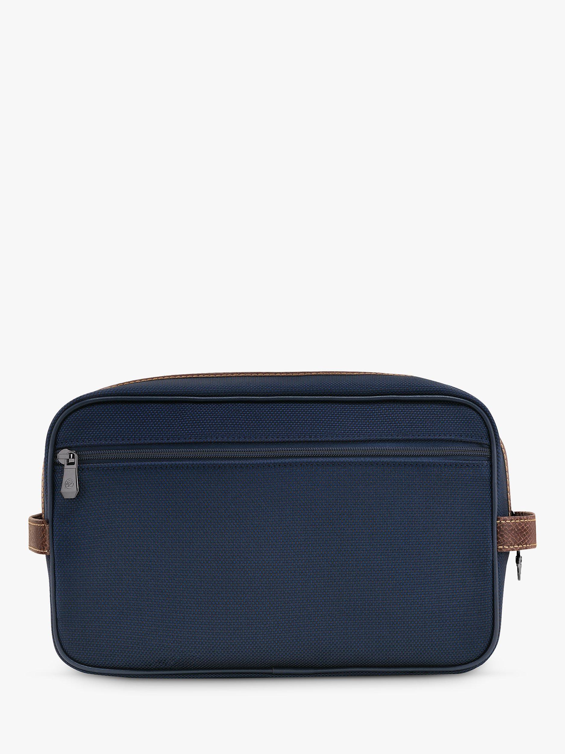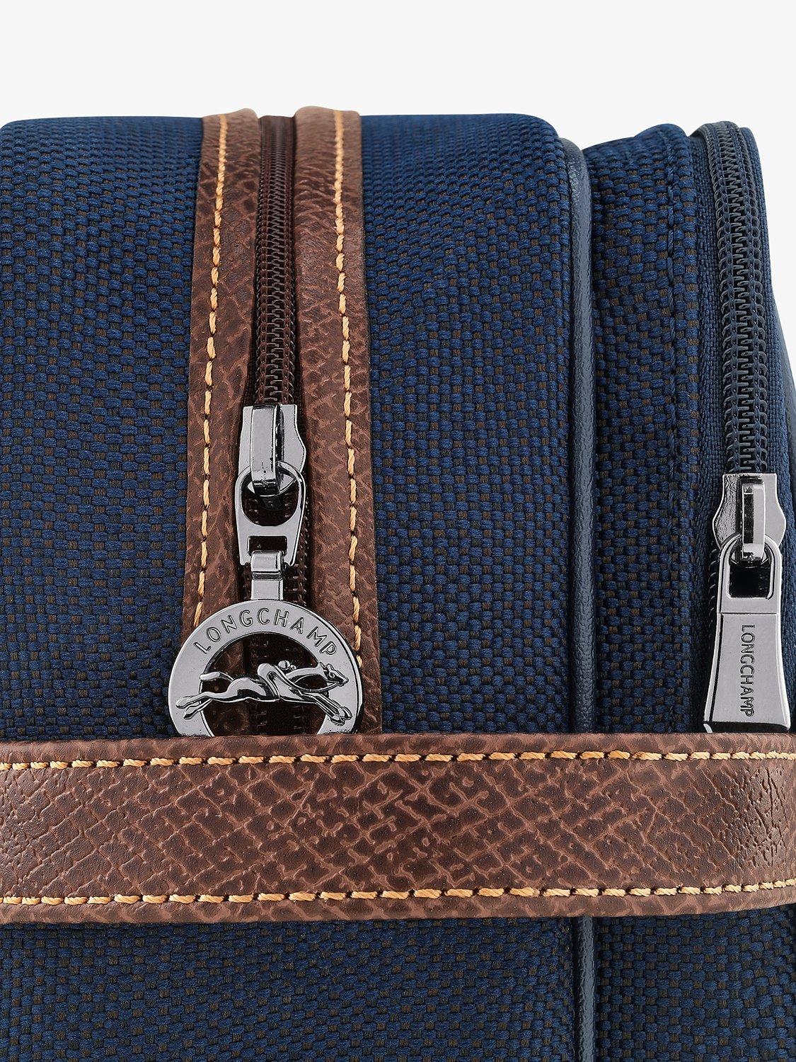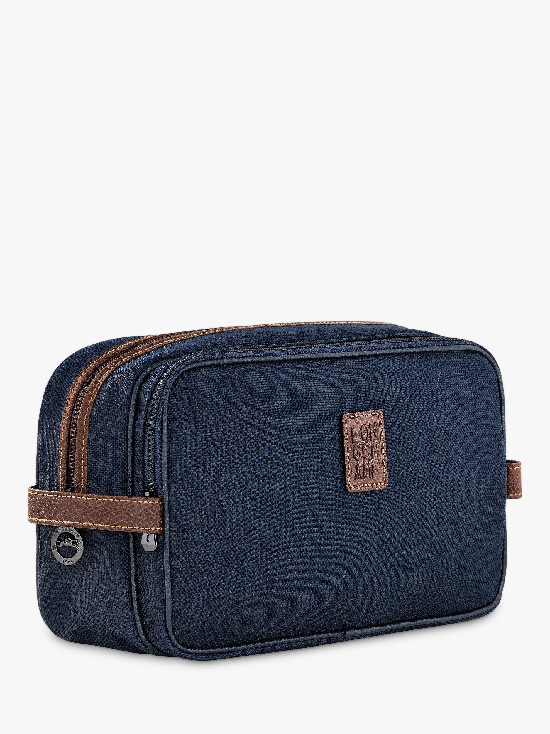 Spacious toiletry case with two zipped compartments, a handle and a washable interior. Made in France, Boxford is Longchamp's iconic range, embodying an understated elegance. Its sober and distinctive design features a rectangular Longchamp embossed logo and contrasting stitching for a refined look. The two-tone canvas is decorated with a Russian leather trim for a rich three-dimensional effect.