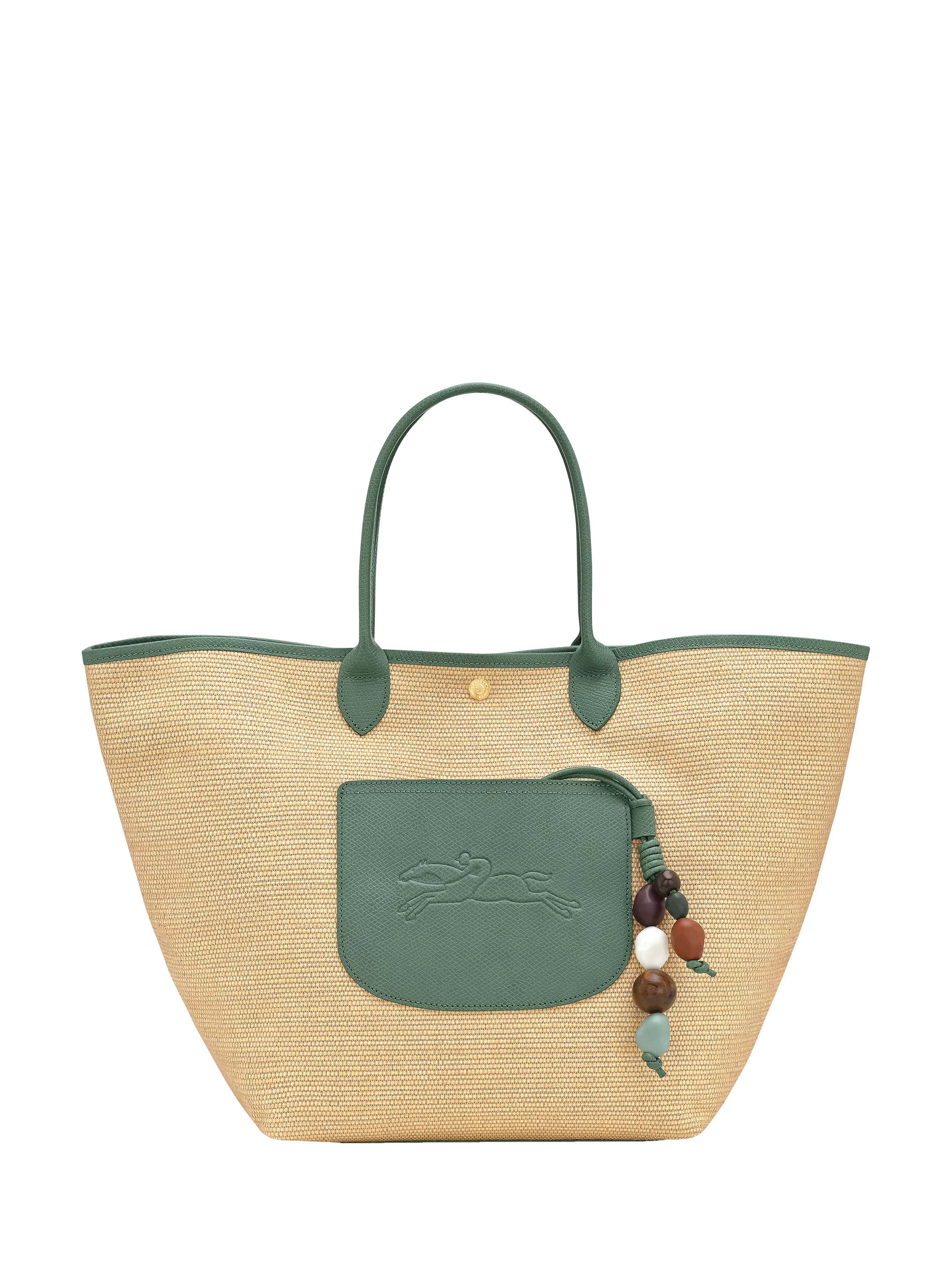 This large Panier Pliage from Longchamp is adorned with a beaded bag charm, reminiscent of ceramic sculptures. The rounded, organic shapes of the beads add an artisanal touch. The cowhide leather handle, pouch, and trim elegantly contrast with the straw-effect canvas.