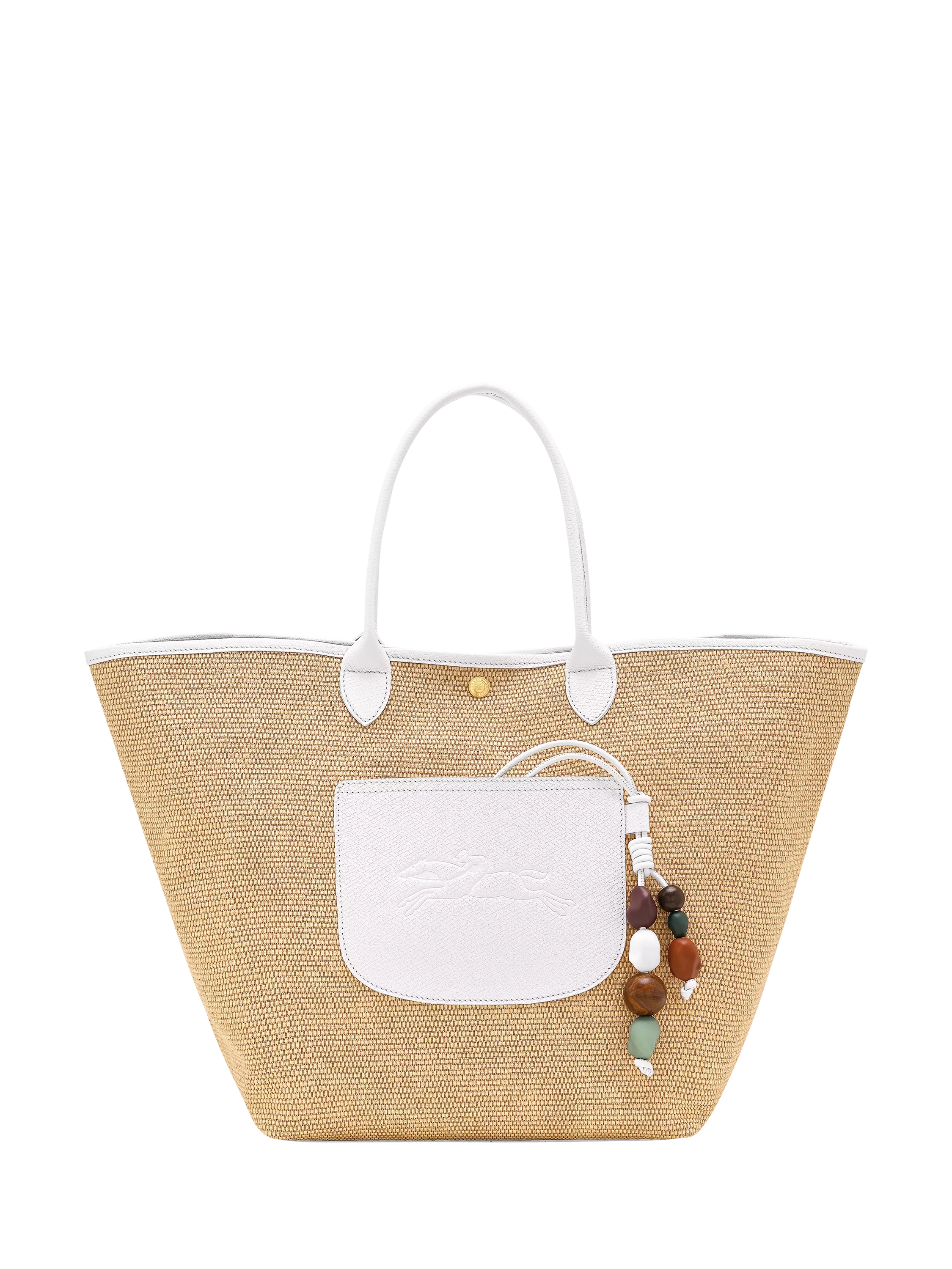This large Panier Pliage from Longchamp is adorned with a beaded bag charm, reminiscent of ceramic sculptures. The rounded, organic shapes of the beads add an artisanal touch. The cowhide leather handle, pouch, and trim elegantly contrast with the straw-effect canvas.