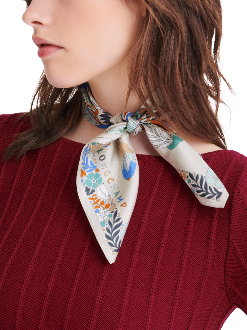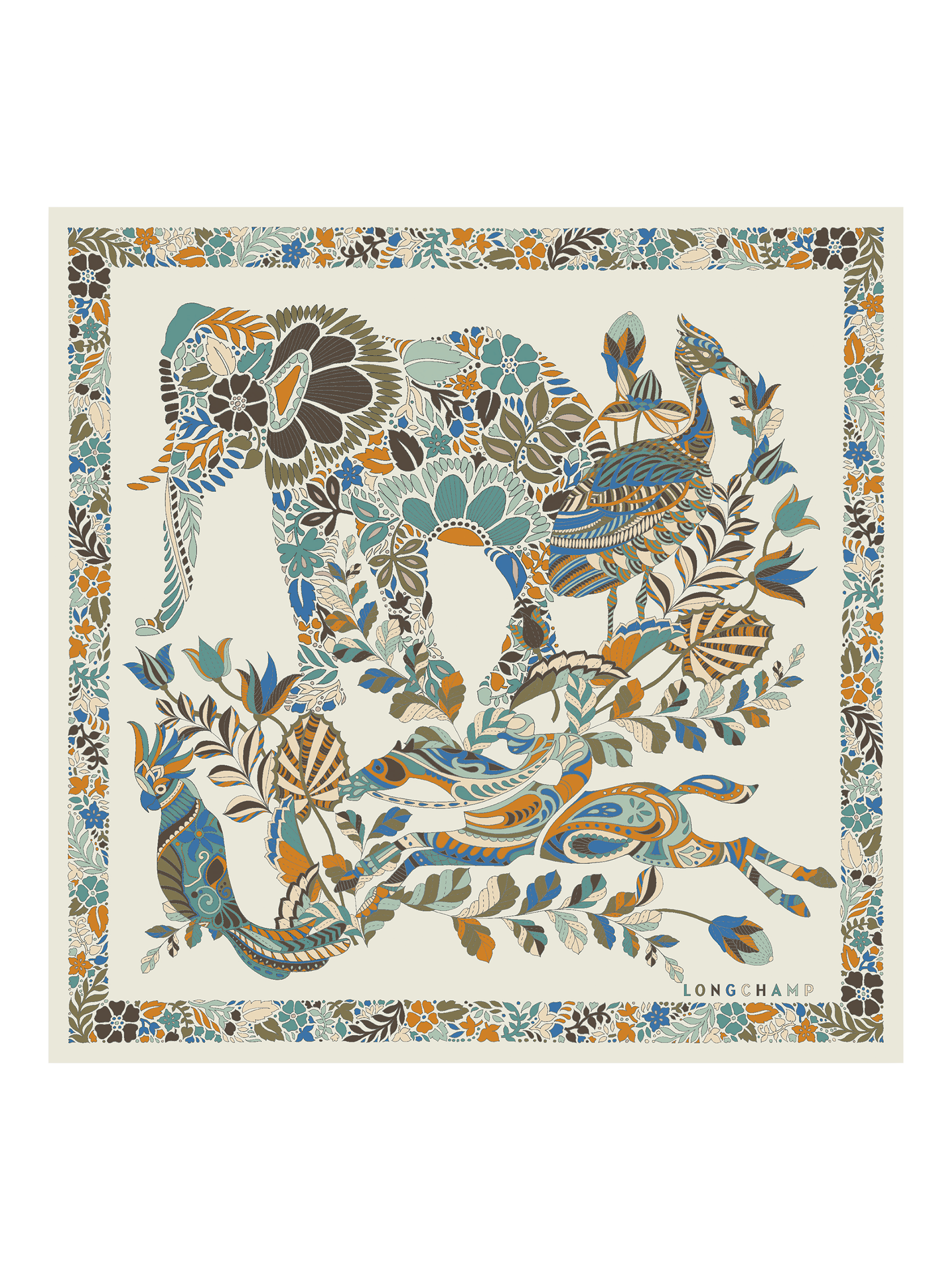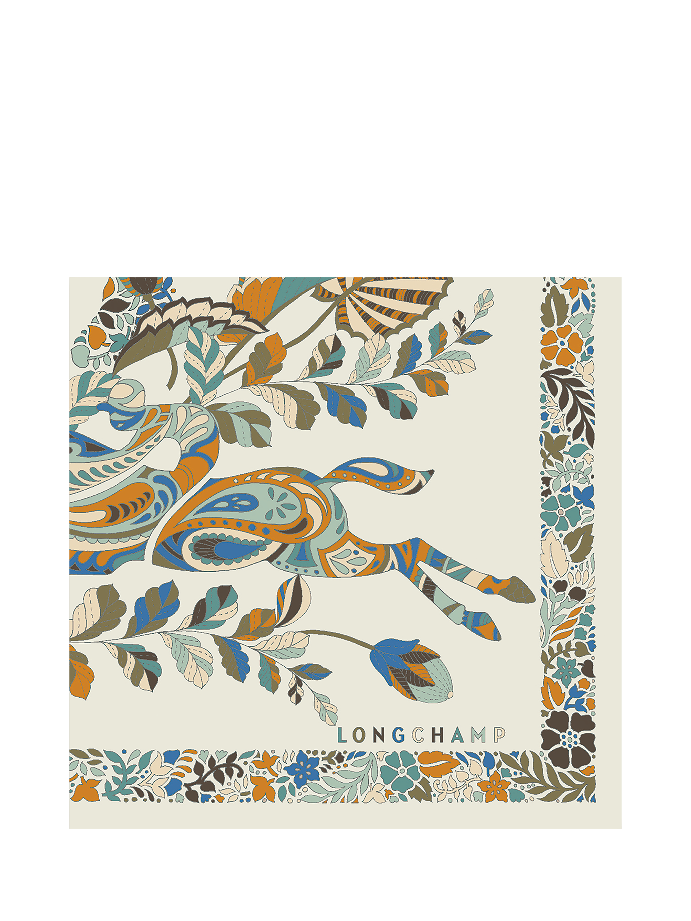 Showcase the vivid colours of nature in bloom with this silk scarf from Longchamp. Let your imagination float and wander through a wonderfully exotic garden. The wildflowers on this silk scarf border an array of wildlife, blending in with lush vegetation. Designed to be versatile, it can be worn around the neck, tied in your hair or used to accessorise your bag.