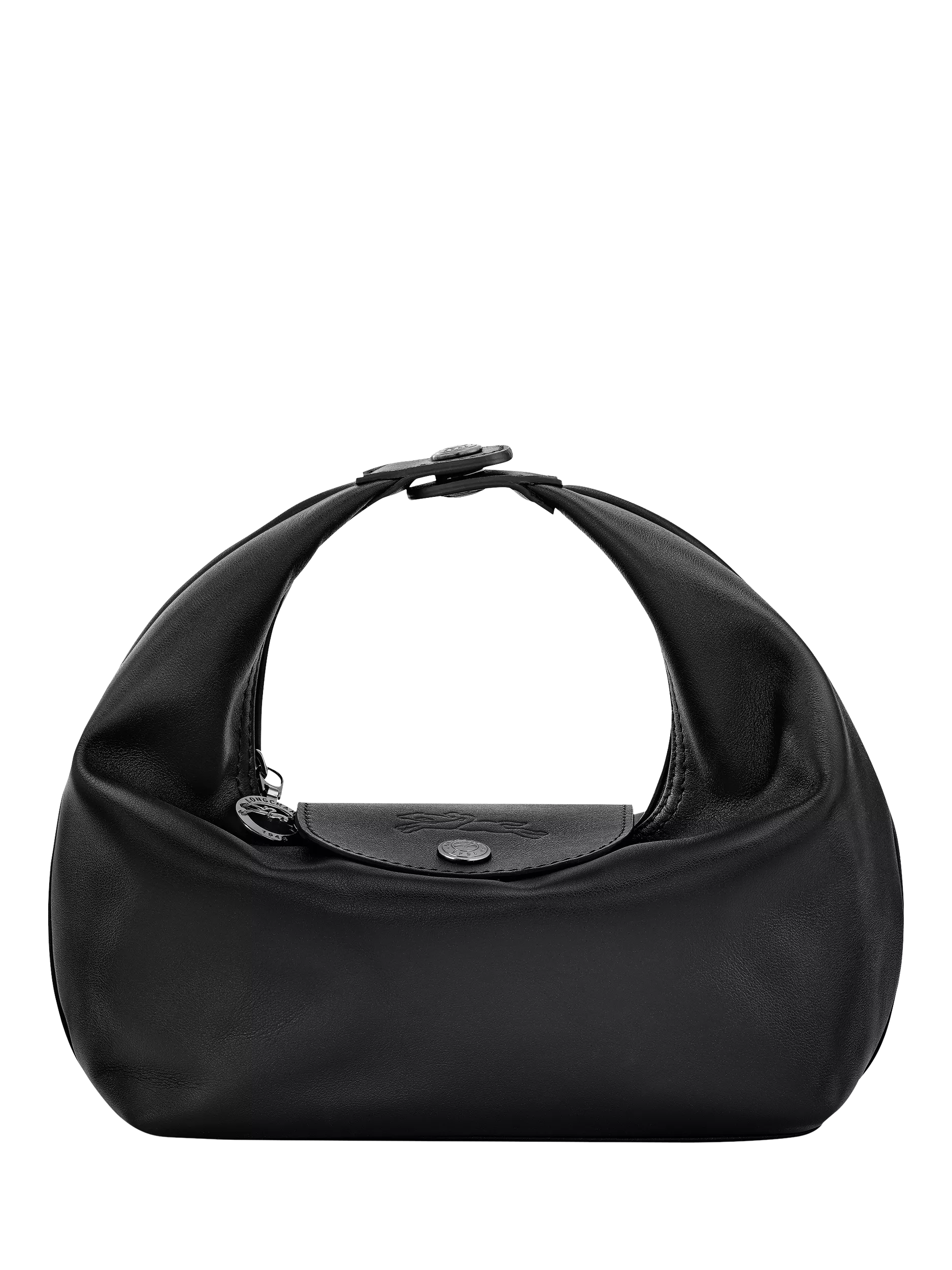 Featuring a compact look and a plush texture imbued with the softness and suppleness of cowhide leather, this trendy handbag boasts a modern, alluring design adorned with details that honor the famous Le Pliage bag. Its original handle closes in on itself with the iconic snap button embossed with Longchamp's iconic logos, highlighting the flap and its embossed horse.